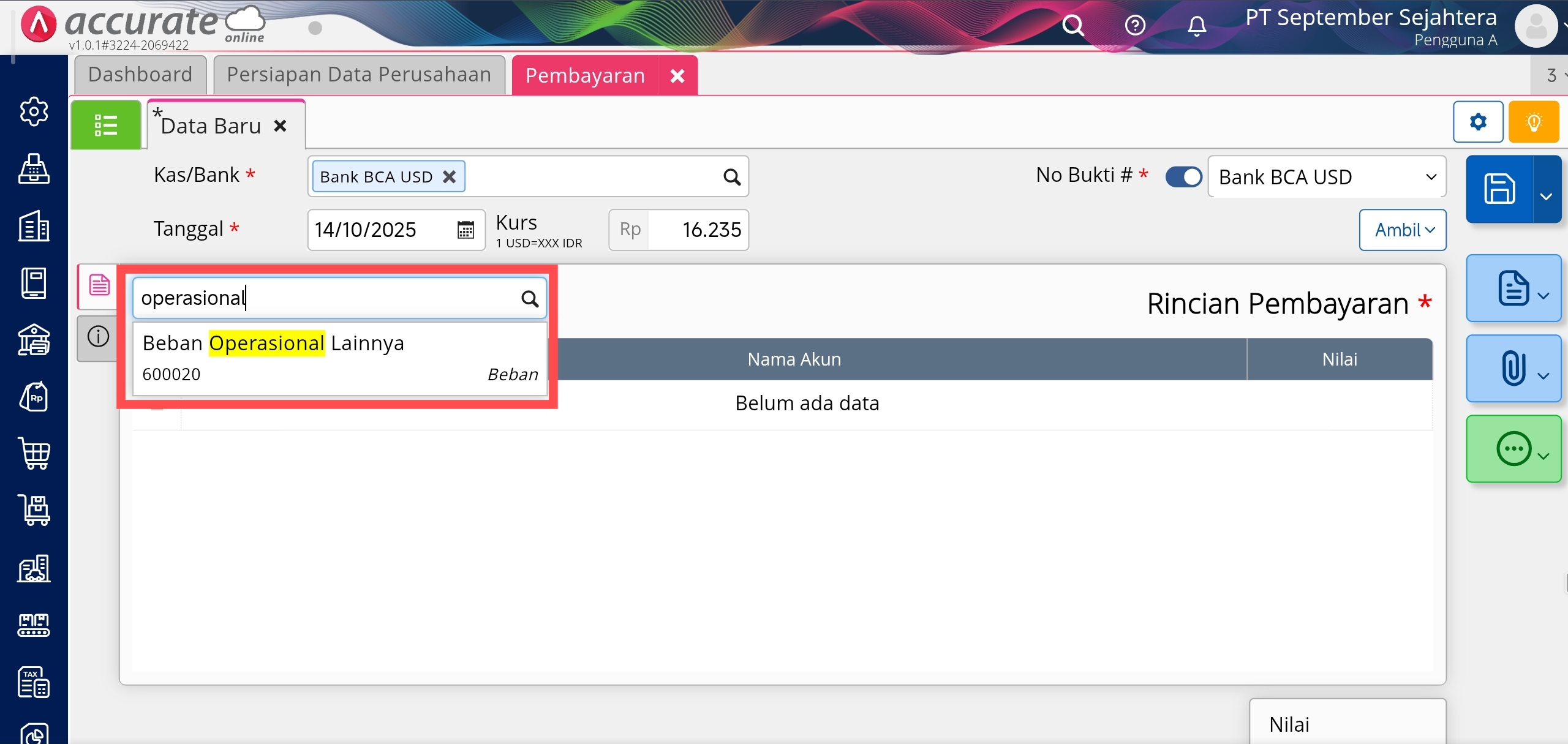 3. Klik pada bagian Cari/Pilih Akun Perkiraan, lalu tentukan akun yang akan menjadi lawan kas atau bank. Contoh jika Anda ingin mencatat biaya operasional, maka carilah akun Biaya Operasional pada bagian Cari/Pilih Akun Perkiraan.
