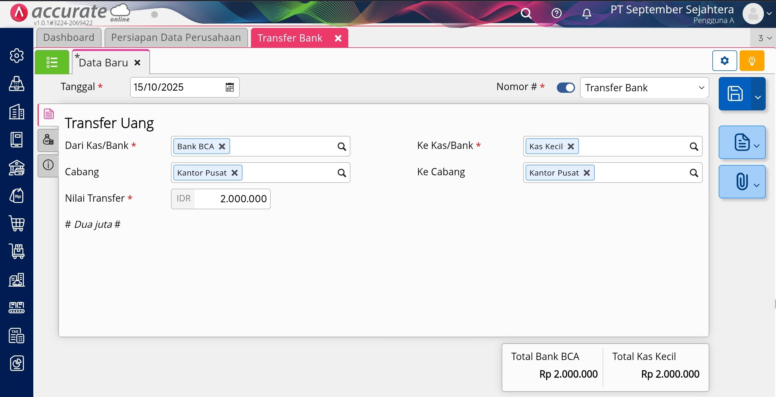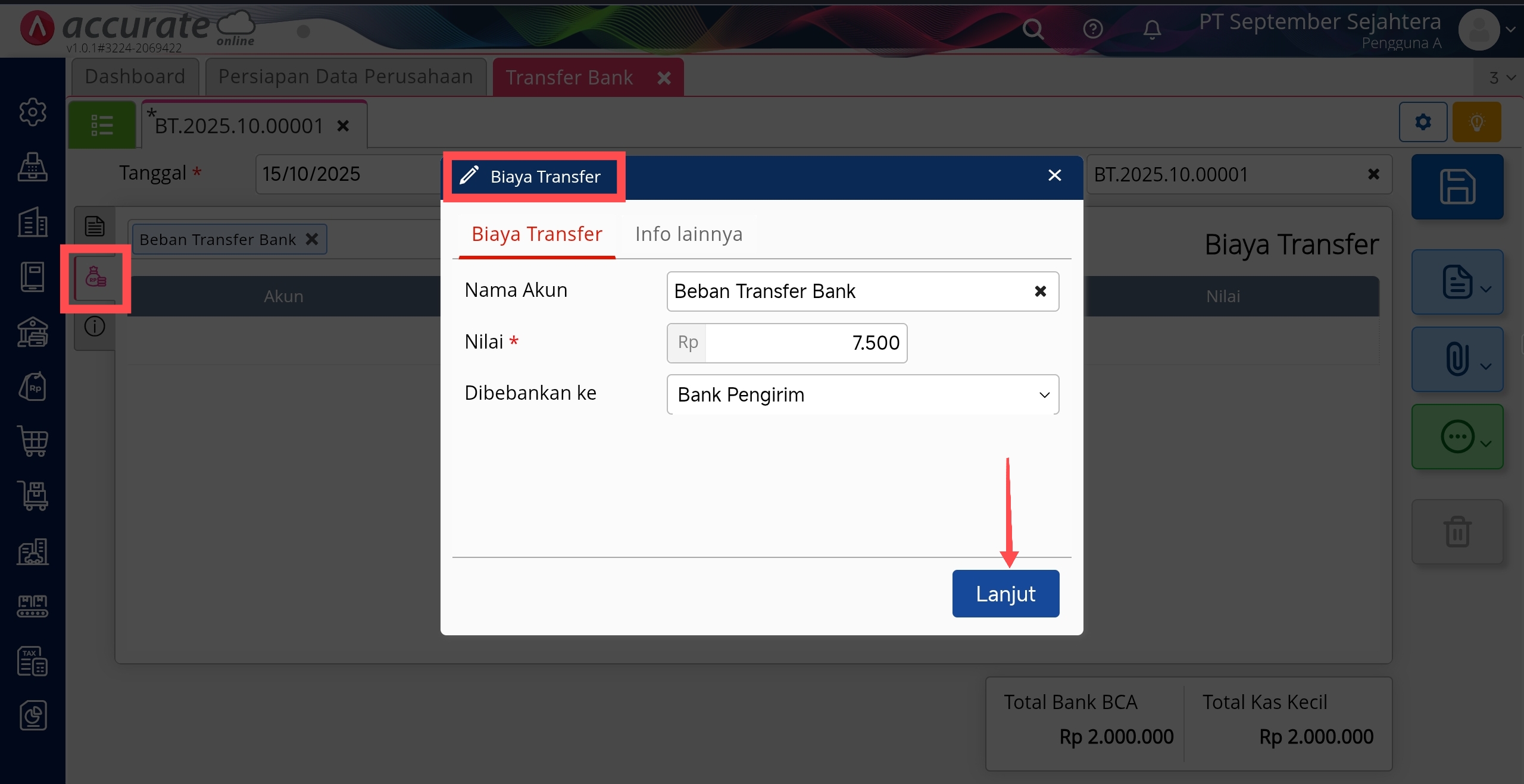 3. Jika pada proses penarikan atau transfer tersebut dikenakan biaya transfer, isi pada bagian yang dilingkari (Biaya Transfer) dengan akun perkiraan beban transfer yang dikeluarkan dan nilai nominalnya, lalu klik Lanjut. Anda juga bisa menentukan biaya transfer tersebut dibebankan ke bank pengirim atau bank peneriman.