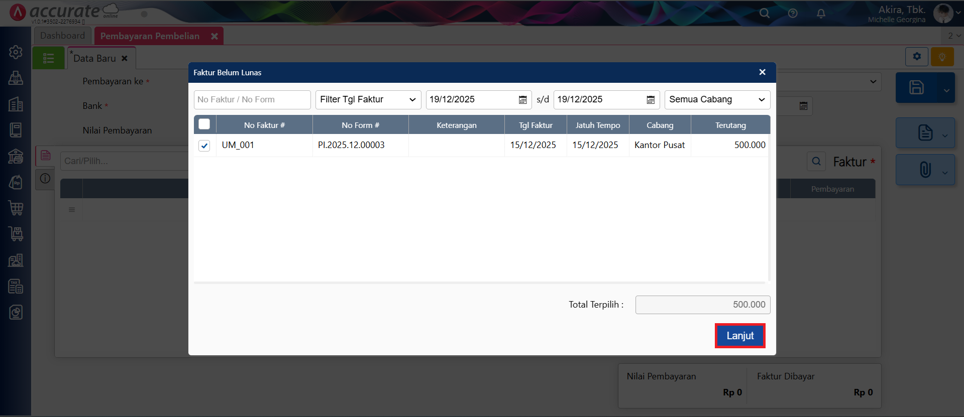 - Tentukan faktur pembelian yang akan dilunasi pembayarannya, lalu klik Lanjut.