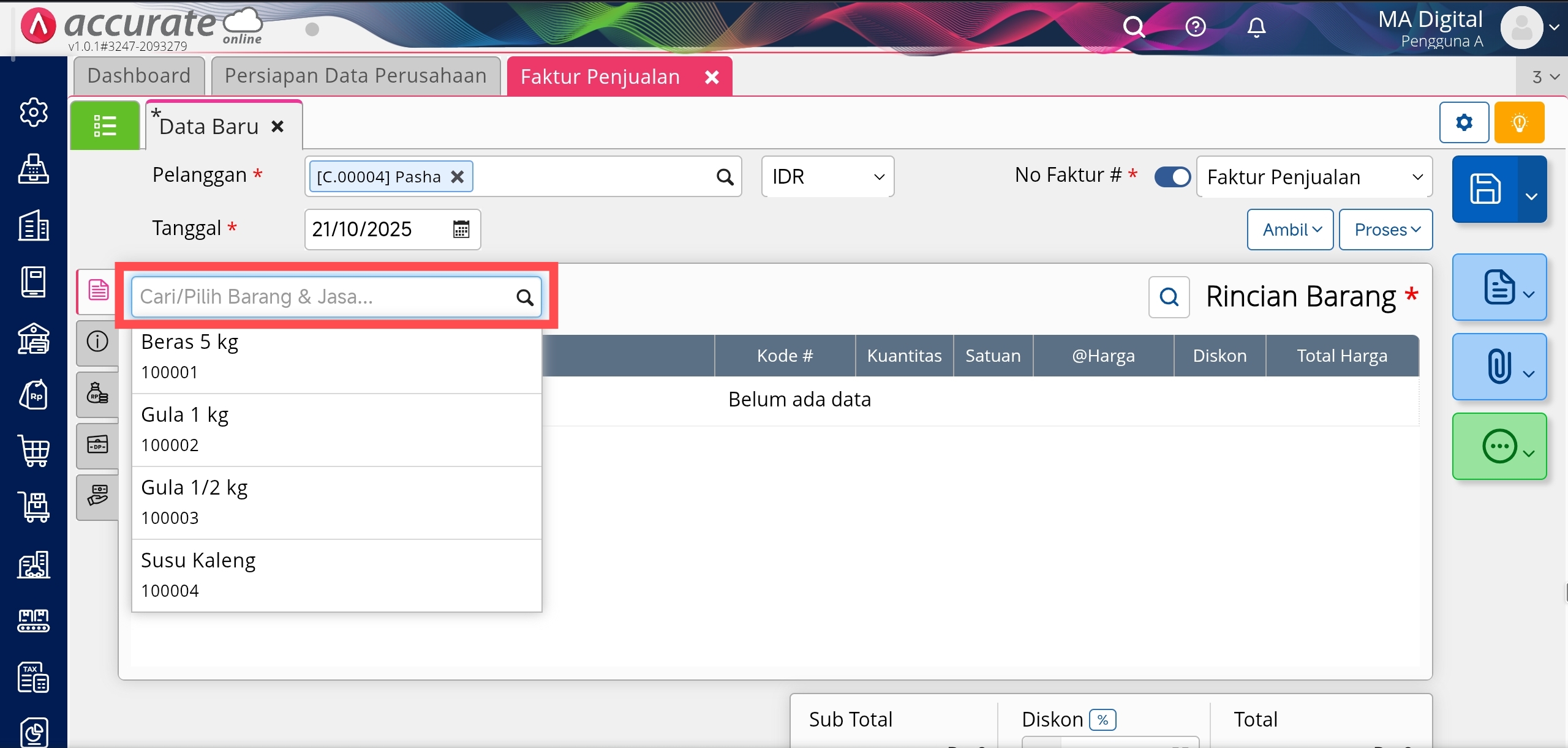Formulir Faktur Penjualan di menu Penjualan