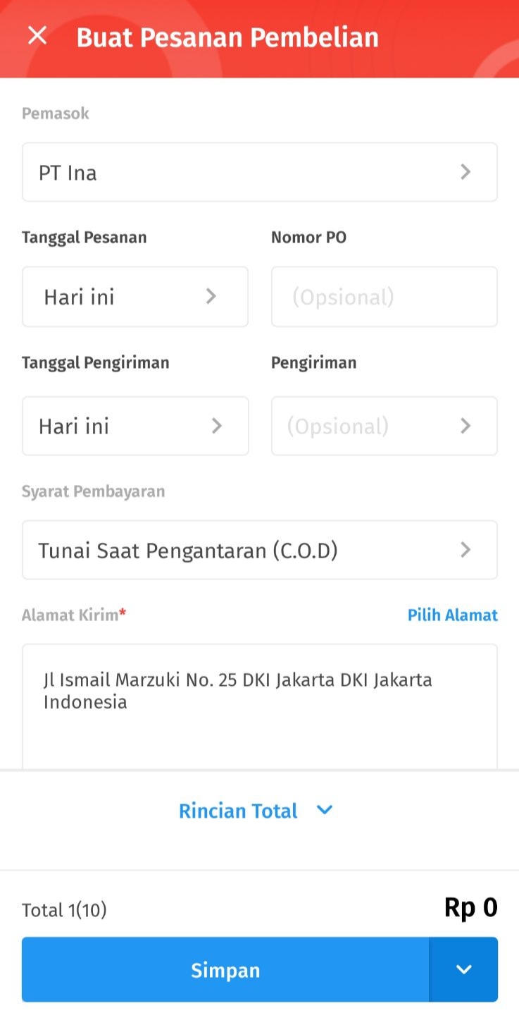 - Lengkapi informasi yang dibutuhkan, seperti Pemasok, Tanggal Pesanan, Alamat Kirim, dan informasi lain sesuai kebutuhan. Kemudian pilih barang yang ingin dipesan.