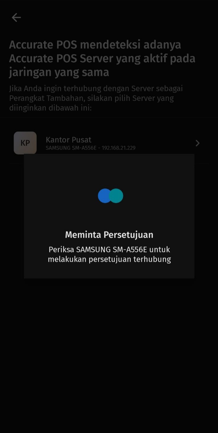 - Tap pada Nama Outlet yang dimaksud dan APOS akan mengirimkan pesan ke Perangkat Server untuk meminta persetujuan mengakses Outlet Tersebut.
