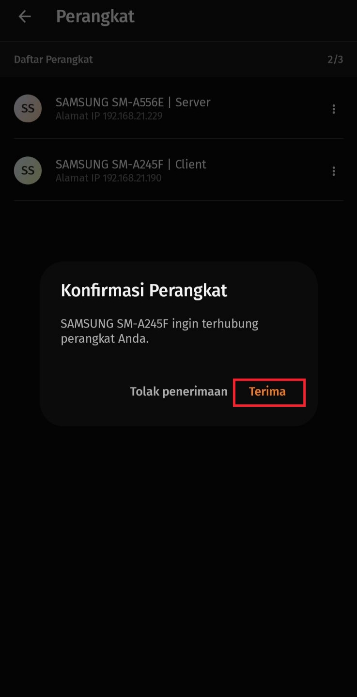 - Pada Perangkat Server, silakan lakukan respon atas pesan yang diterima, yaitu dengan tap Terima untuk menyetujui menghubungkan perangkat baru tersebut.