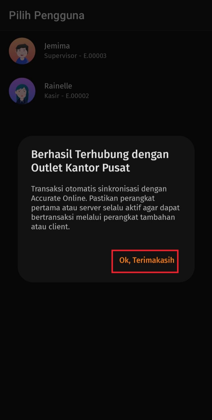 - Setelah direspon terima oleh Perangkat Server, pada perangkat tersebut akan tampil pesan Konfirmasi Berhasil terhubung dengan outlet tersebut.
