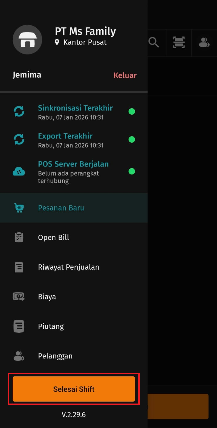 - Klik icon disamping informasi Pesanan Baru, lalu klik Selesai Shift pada bagian bawah menu tersebut.