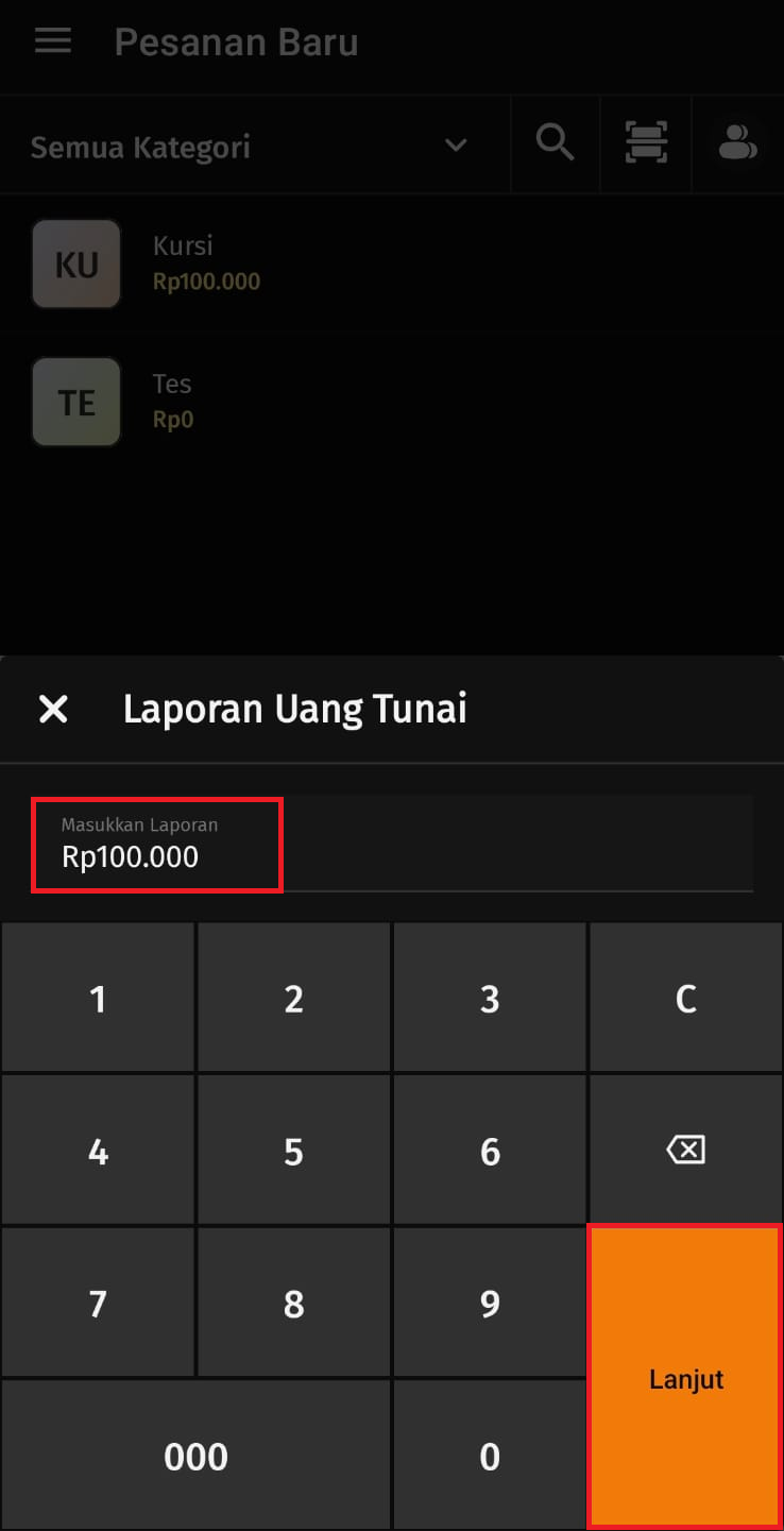 - Dan akan tampil Laporan Uang Tunai, isikan dengan jumlah uang tunai yang ada di tangan (cash on hand) kemudian klik Lanjut. Atau jika transaksi penjualan anda tidak ada pembayaran Tunai bisa dikosongkan saja dan langsung klik Lanjut.