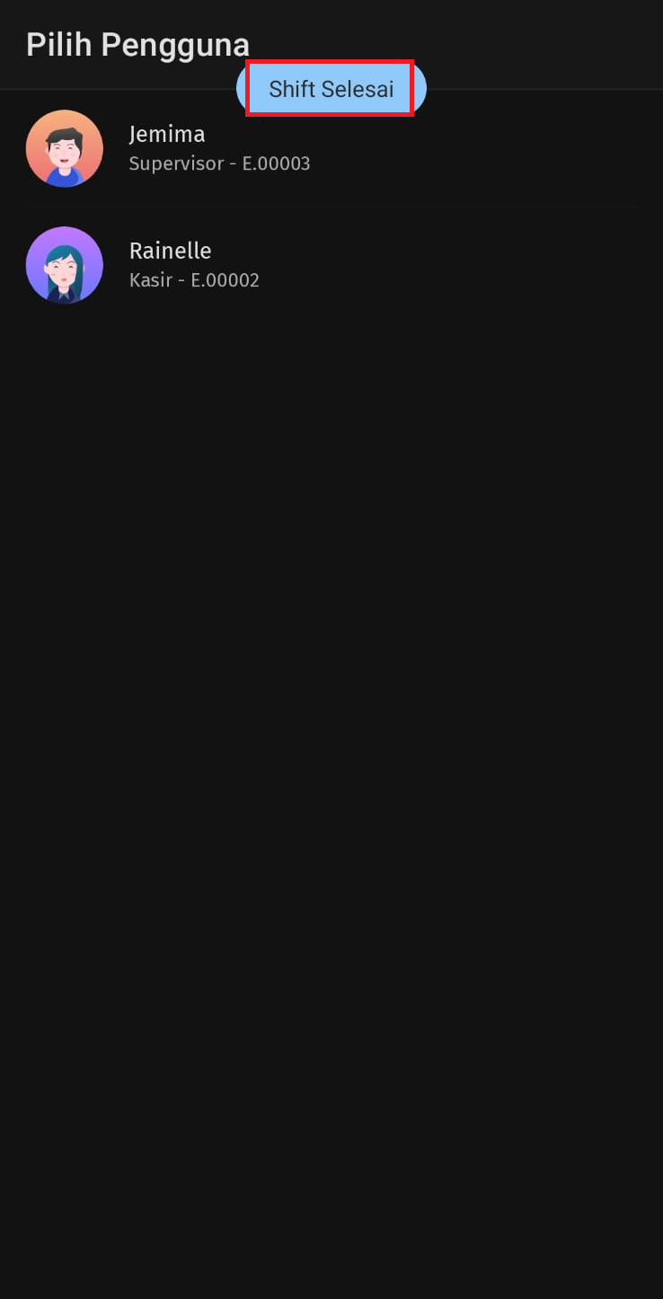 - Setelahnya akan ada informasi Selesai Shift. Dengan demikian shift atas pengguna tersebut telah selesai, dan status shiftnya akan berubah dari Shift Berjalan ke Shift Selesai.