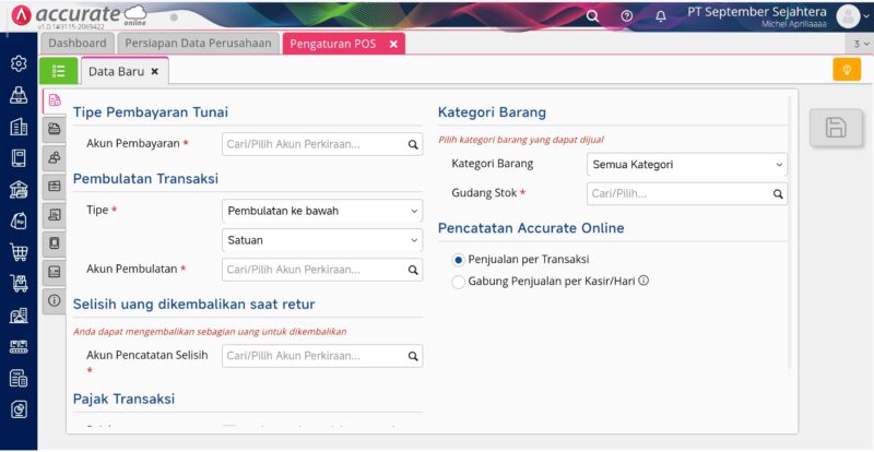 Sesaat setelah install aplikasi fitur Accurate POS, menu Pengaturan POS akan tampil atau anda juga bisa mengakses-nya melalui menu Pengaturan di database Accurate Online anda. Menu Pengaturan POS pada database Accurate Online ini berfungsi untuk mengatur data serta informasi yang diperlukan terkait dengan transaksi penjualan pada aplikasi Accurate POS di outlet (cabang).