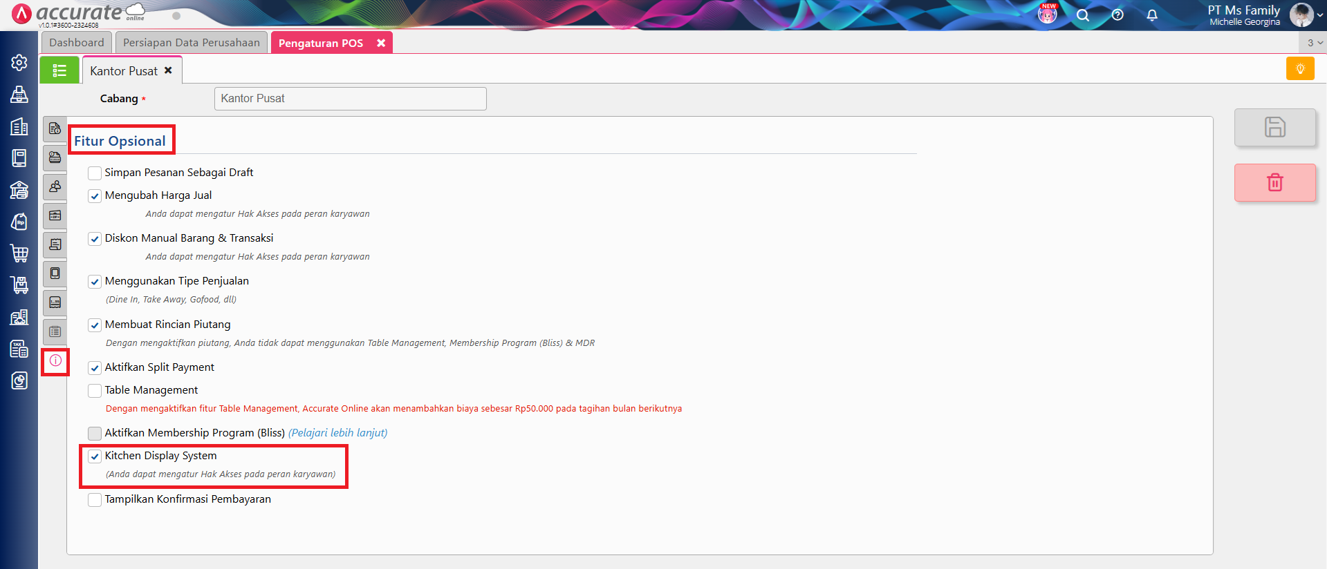 Centang fitur Kitchen Display System