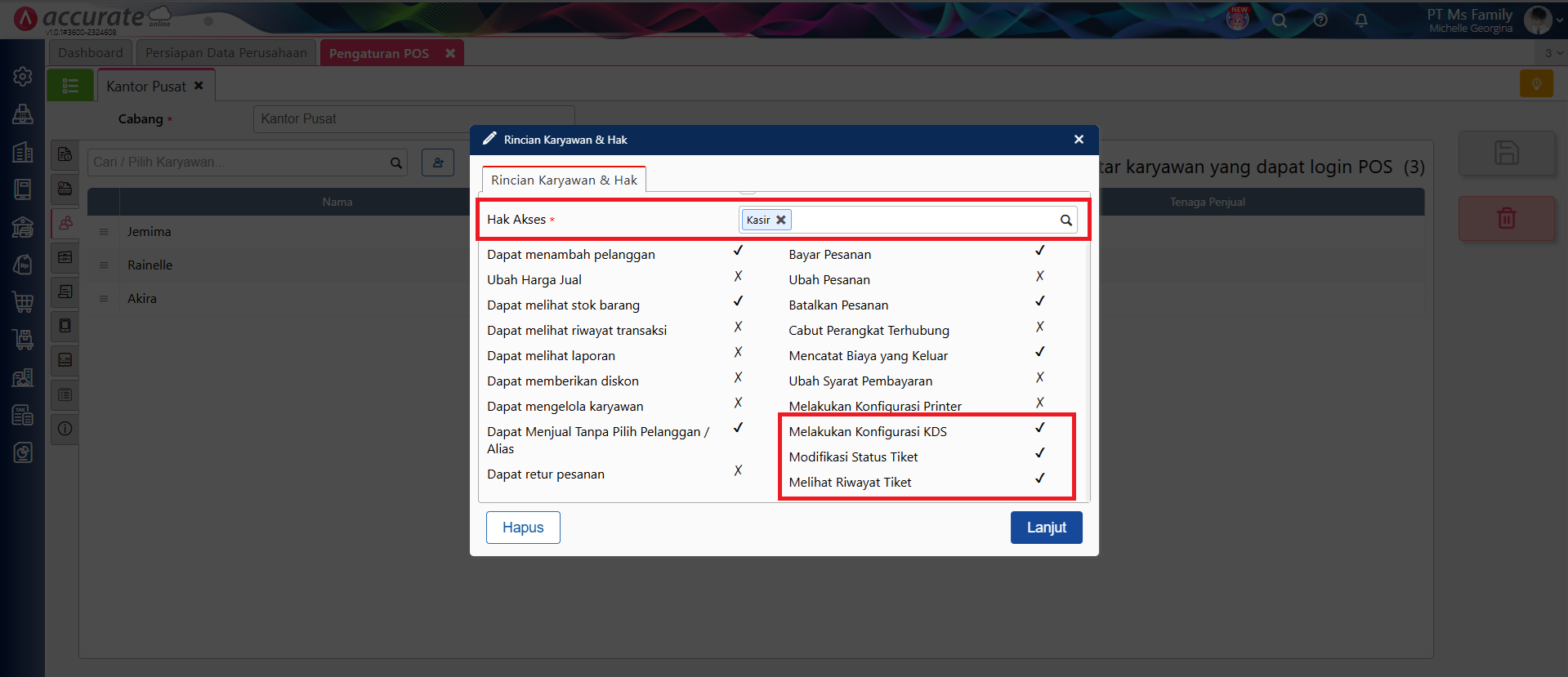 - Sehingga, ketika menambahkan karyawan yang dapat login ke aplikasi Accurate POS, akan tampil hak akses yang sudah diberikan pada poin 5.