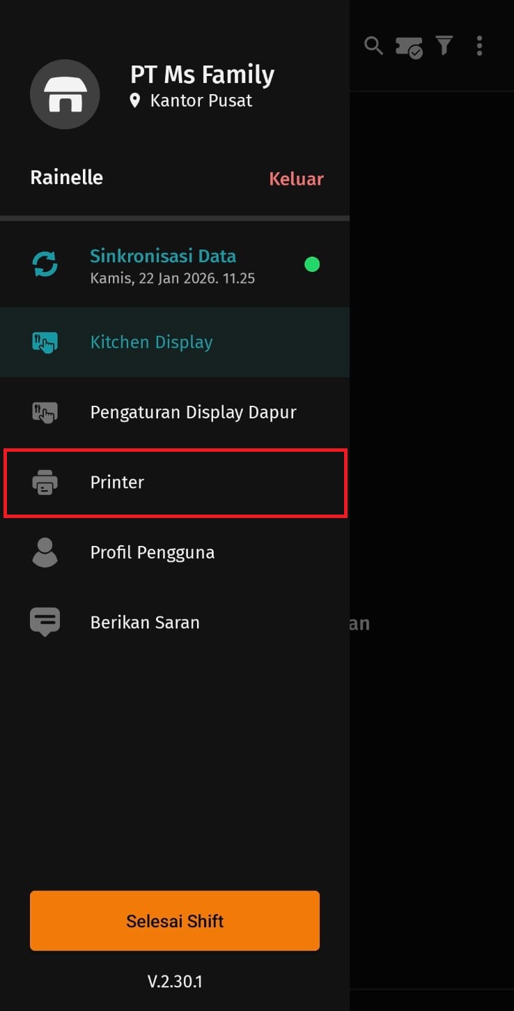2. Kemudian klik pada tombol titik tiga garis di samping informasi Nama Kitchen Display, lalu pilih menu Printer.