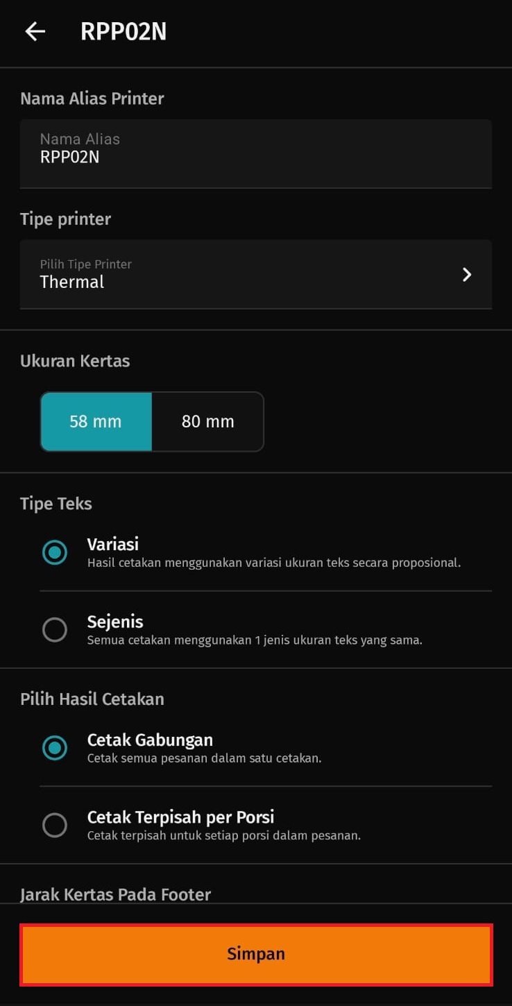 5. Pilih printer yang dimaksud, kemudian lakukan pengaturan sesuai kebutuhan, seperti Tipe Printer, Ukuran Kertas, Tipe Teks, Pilih Hasil Cetakan, Jarak Kertas Pada Footer, lalu klik Simpan.