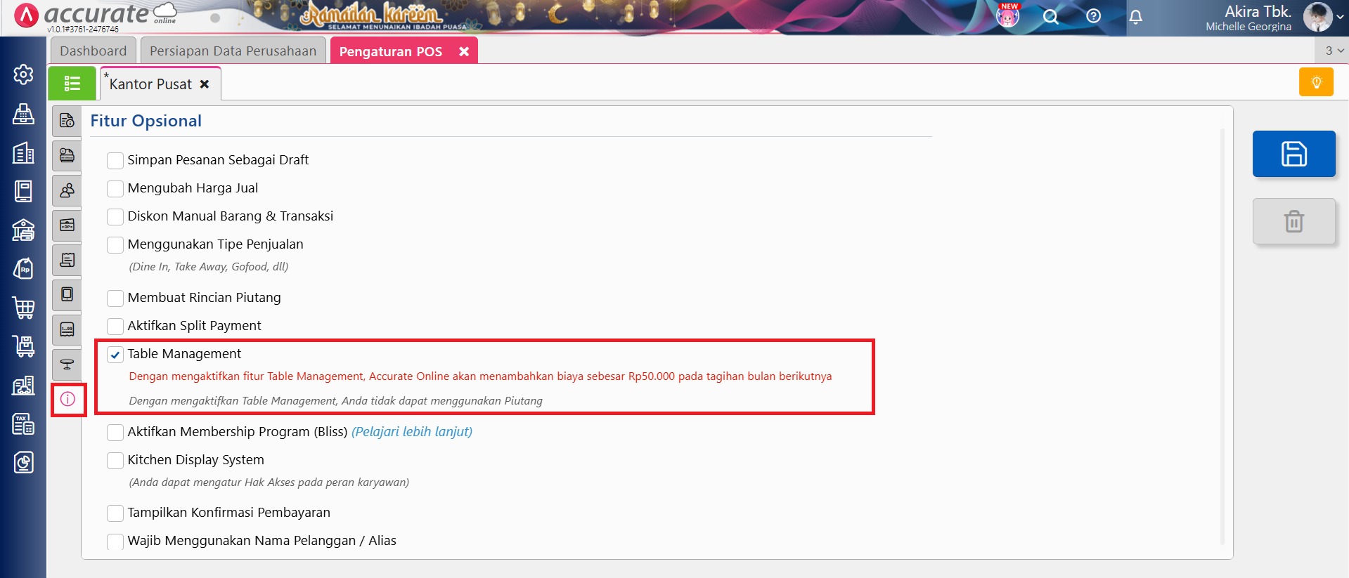 Table management merupakan fitur pada Accurate POS yang berfungsi untuk mengatur pesanan per meja, yang akan mempermudah proses pencatatan dan pengelolaan bisnis Anda. Berikut cara mengaktifkan fitur Table Management pada Accurate POS :