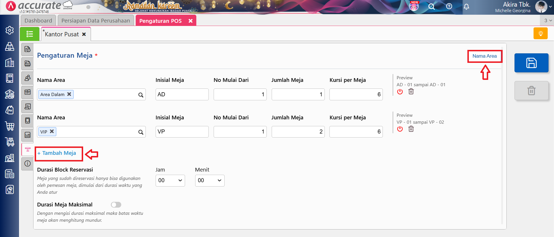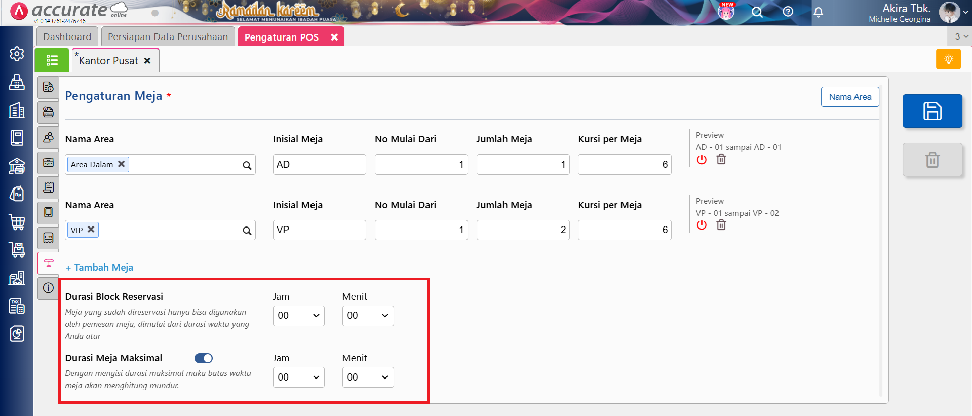 Durasi block reservasi berfungsi untuk mem-block meja yang sudah direservasi pada durasi yang telah ditentukan. Misalnya diisikan dengan 30 menit, maka jika ada yang melakukan reservasi pada meja tersebut di pukul 13.00 WIB saat dilakukan pemesanan di pukul 12.30 WIB meja tersebut tidak bisa dipilih untuk digunakan. Sedangkan pada Durasi Meja Maksimal berfungsi untuk membatasi durasi makan ditempat (dine in). Jika diaktifkan dan diisikan 1 jam 30 menit, saat meja terisi, Accurate POS akan melakukan perhitungan mundur sesuai durasi tersebut.