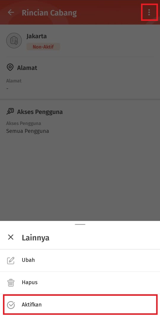 - Setelah tampil Rincian Cabang tersebut, klik tombol titik tiga di bagian pojok kanan atas, lalu pilih Aktifkan.