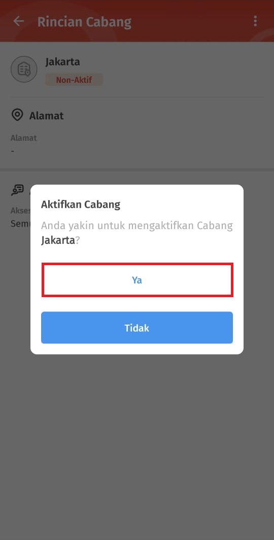- Pada pesan konfirmasi yang tampil, klik tombol Ya untuk mengkonfirmasi pengaktifan cabang.
