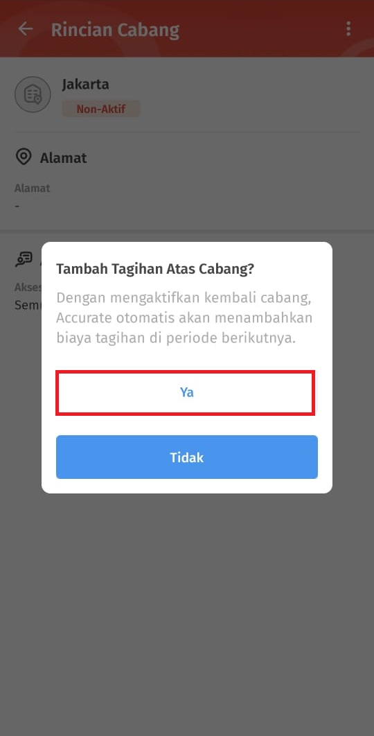 Tekan Ya pada informasi ‘Tambah Tagihan Atas Cabang’