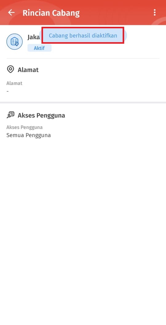 - Dan akan tampil informasi ‘Cabang berhasil diaktifkan‘.