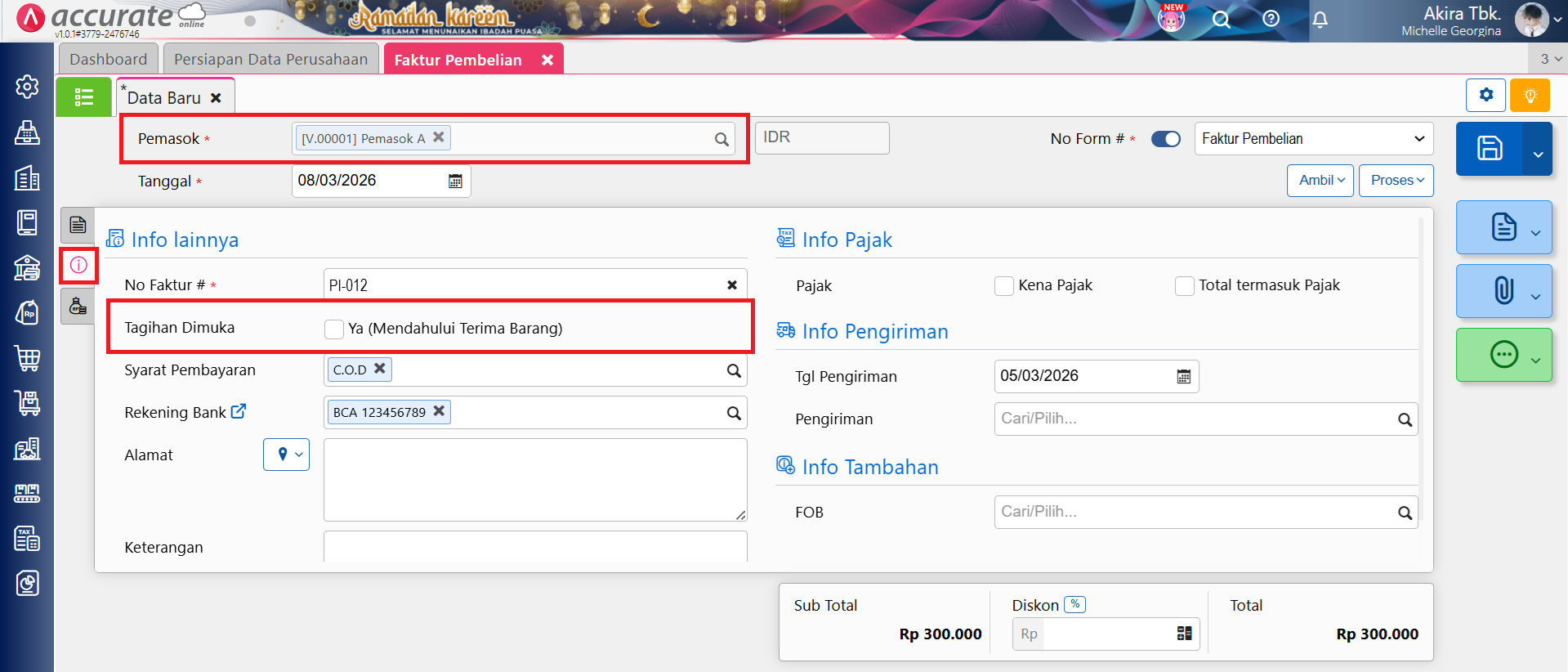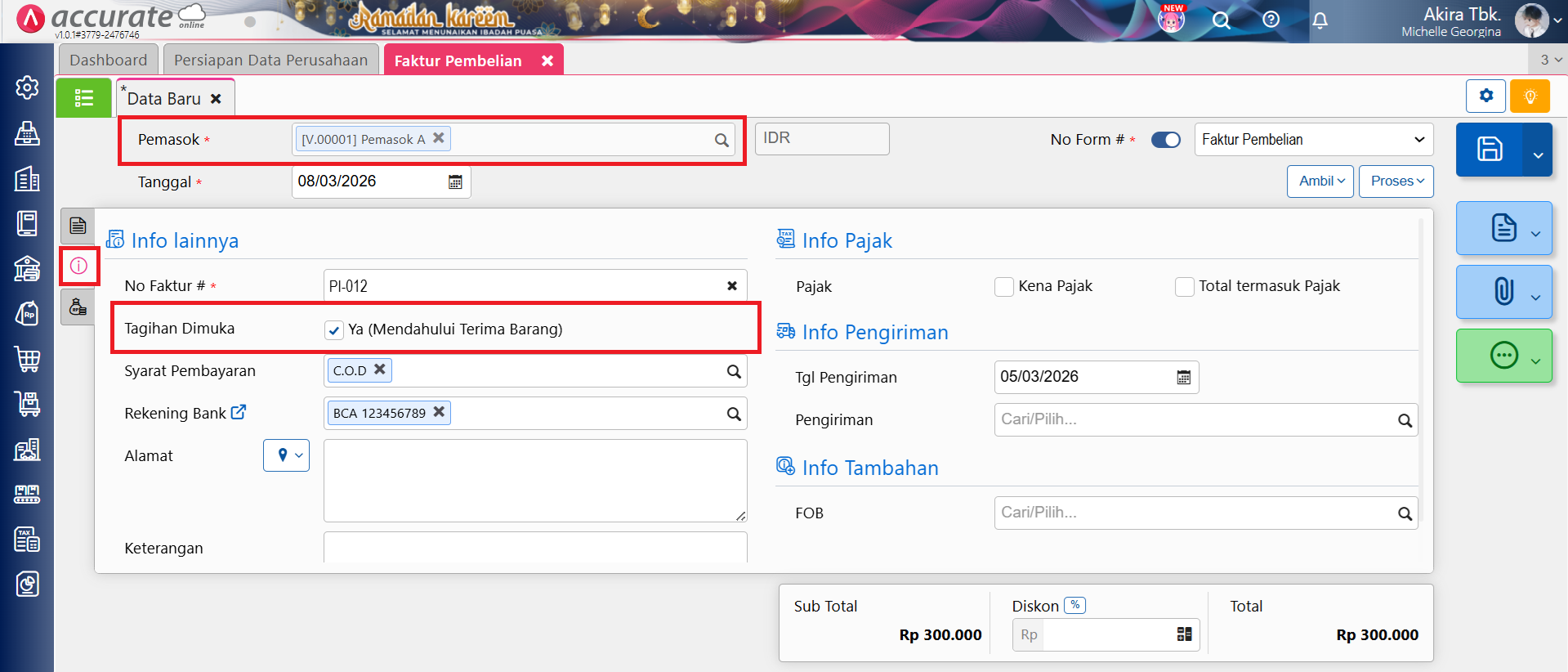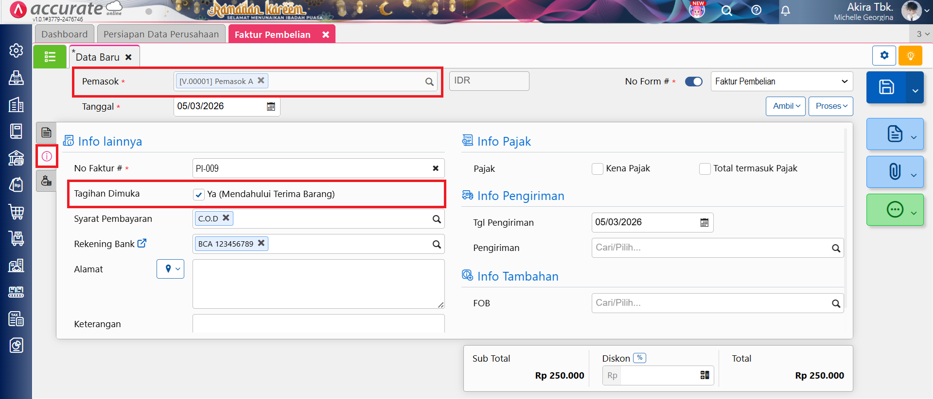 Pada Accurate Online, apabila Anda ingin membuat transaksi Faktur Pembelian (Mendahului Terima Barang) secara otomatis tanpa harus centang informasi Ya (Mendahului Terima Barang) secara manual, maka bisa dilakukan dengan cara membuat transaksi Faktur Pembelian (Mendahului Terima Barang) 3 kali secara berturut-turut atas pemasok tersebut, misal Pemasok A.