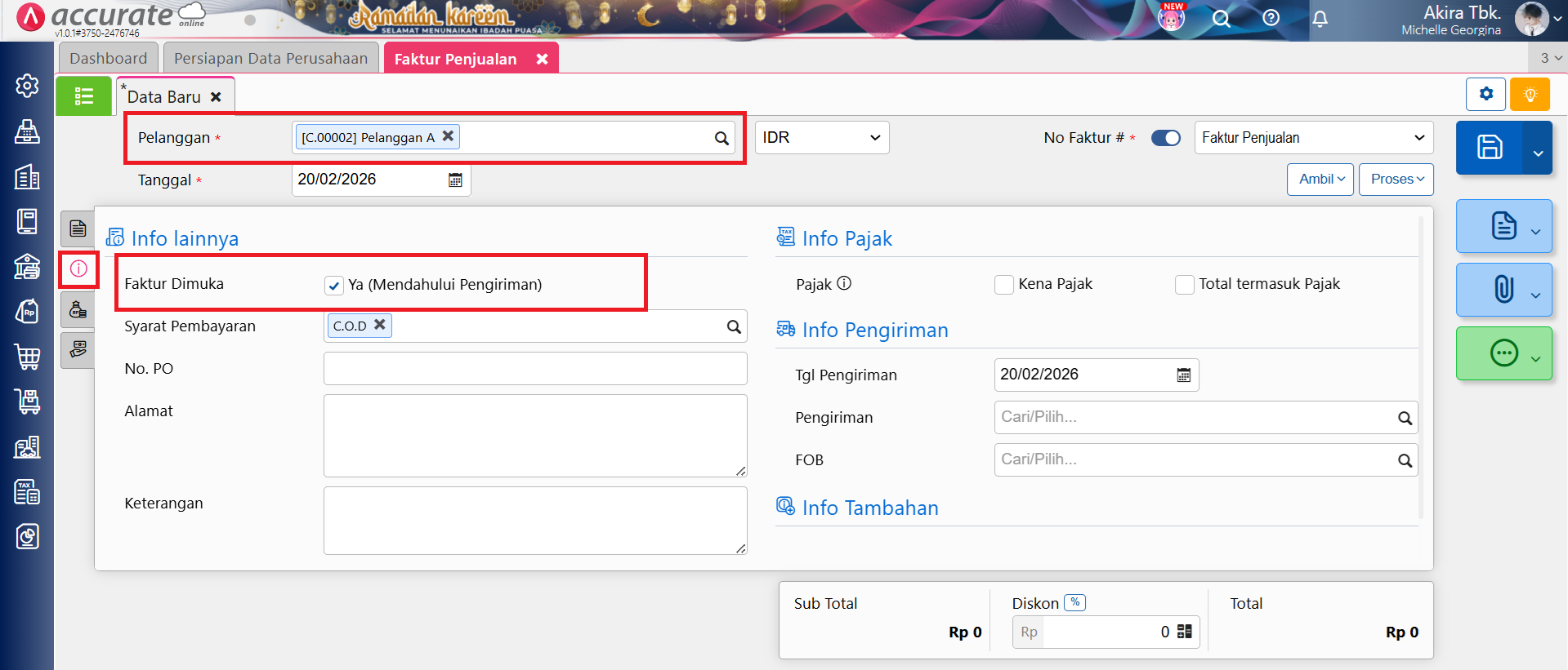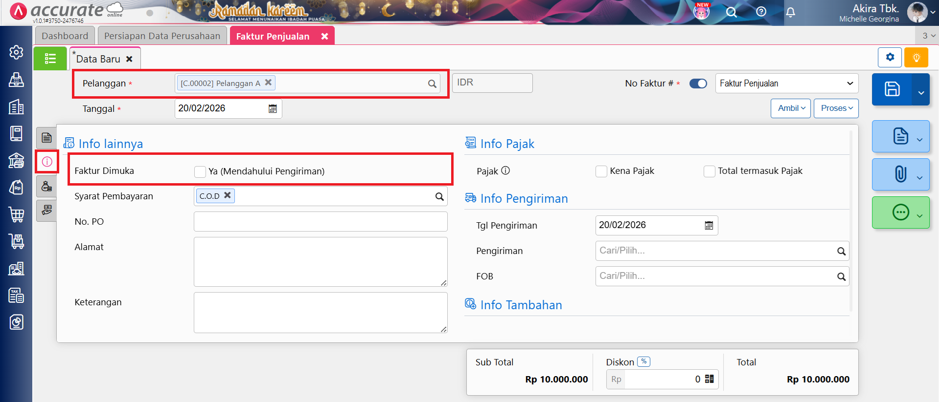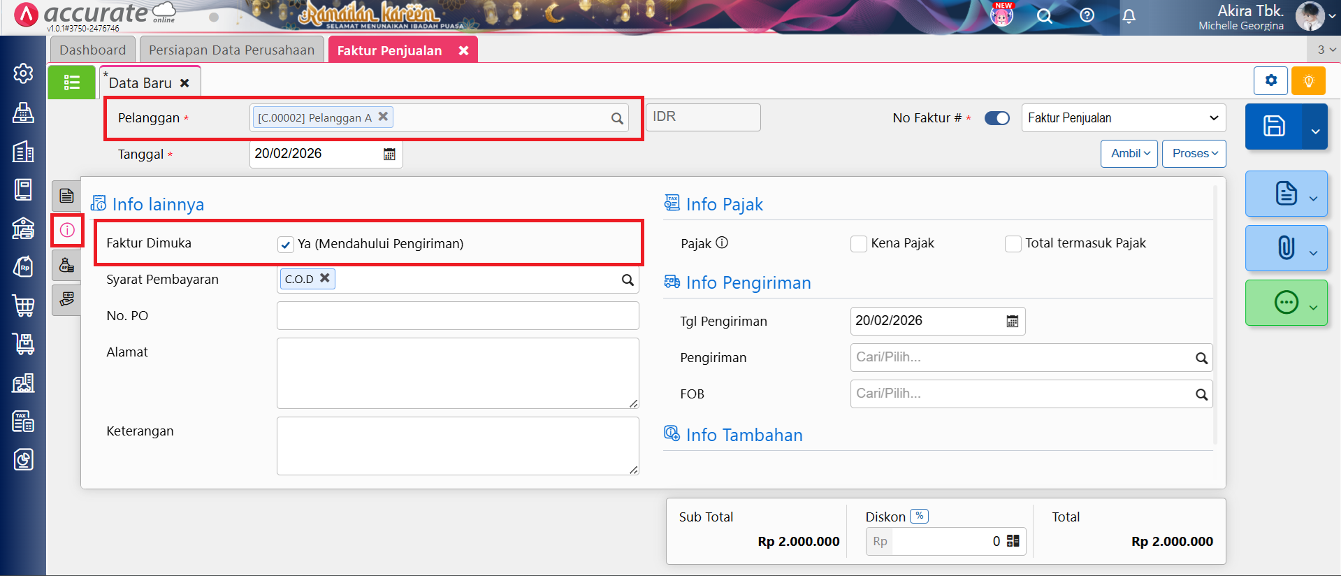 Pada Accurate Online, apabila Anda ingin membuat transaksi Faktur Penjualan (Mendahului Pengiriman) secara otomatis tanpa harus ceklis informasi ‘Ya (Mendahului Pengiriman)‘ secara manual, maka bisa dilakukan dengan cara membuat transaksi Faktur Penjualan (Mendahului Pengiriman) 3 kali secara berturut-turut atas pelanggan tersebut, misal Pelanggan A.