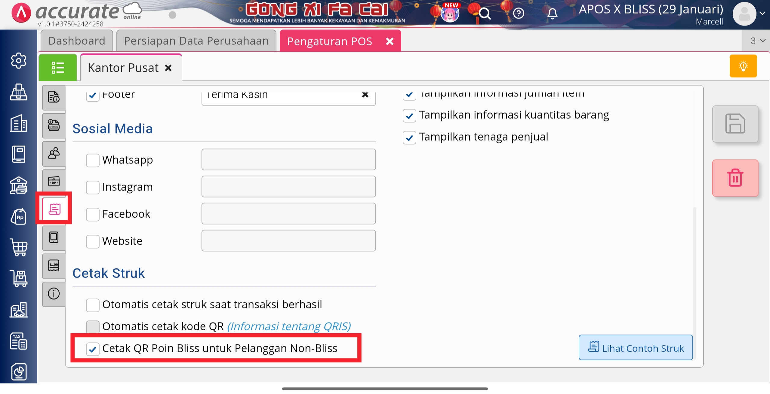 Apabila Outlet Accurate POS Anda sudah terintegrasi dengan Bliss, dan ingin menampilkan QR Code Bliss pada hasil cetak struk transaksinya supaya pelanggan Non Bliss (bukan member bliss) bisa bergabung menjadi member Bliss Anda, berikut langkah-langkah yang perlu dilakukan: