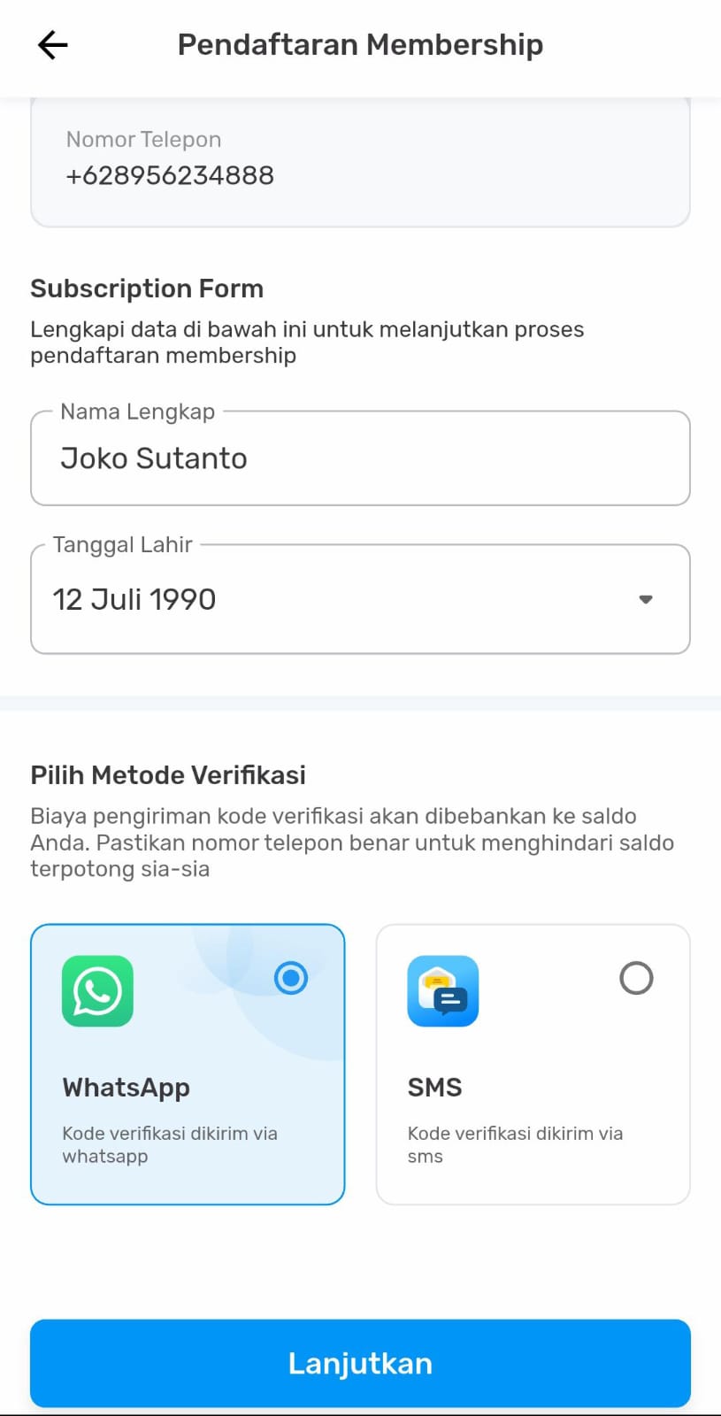 - Maka akan tampil konfirmasi pendaftaran membership, maka klik tombol Konfirmasi, dan nantinya akan dikirim kode verifikasi ke nomor telepon yang didaftarkan.