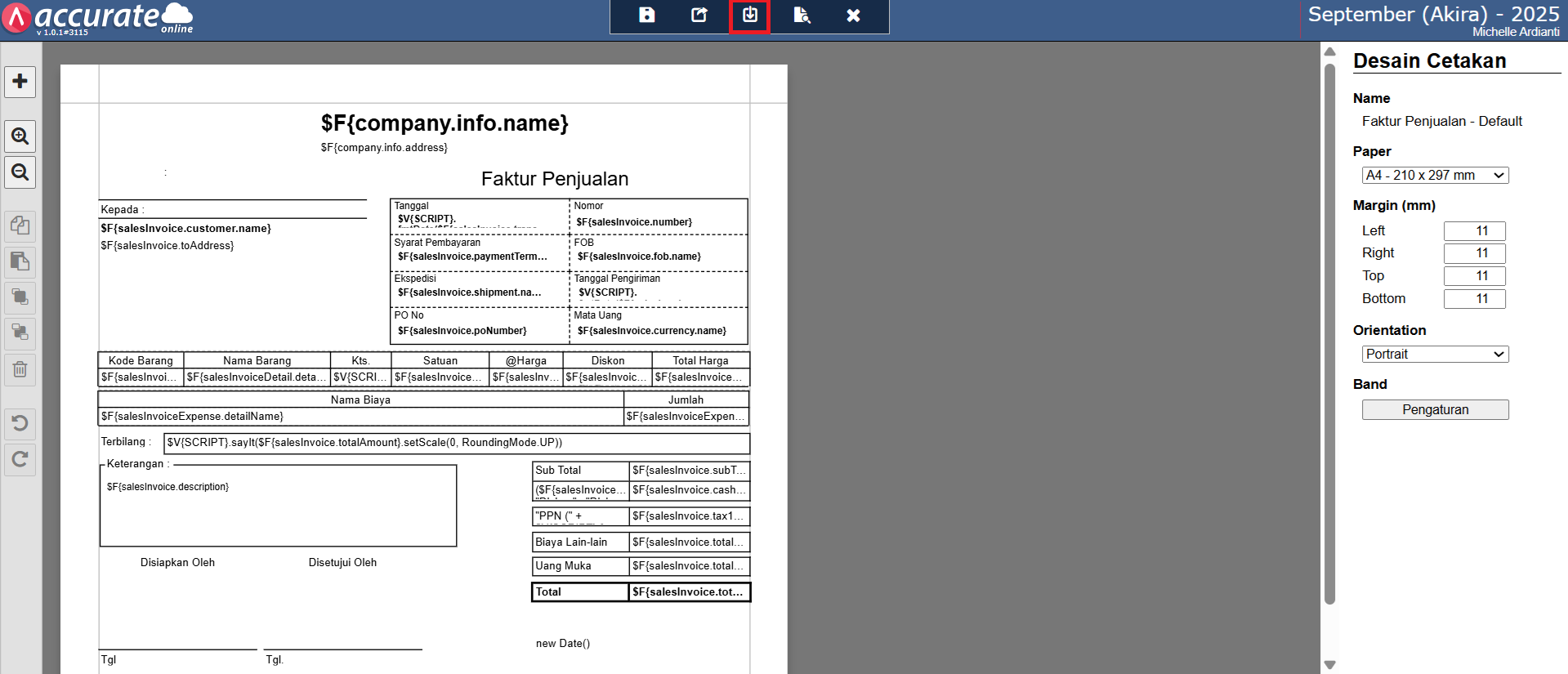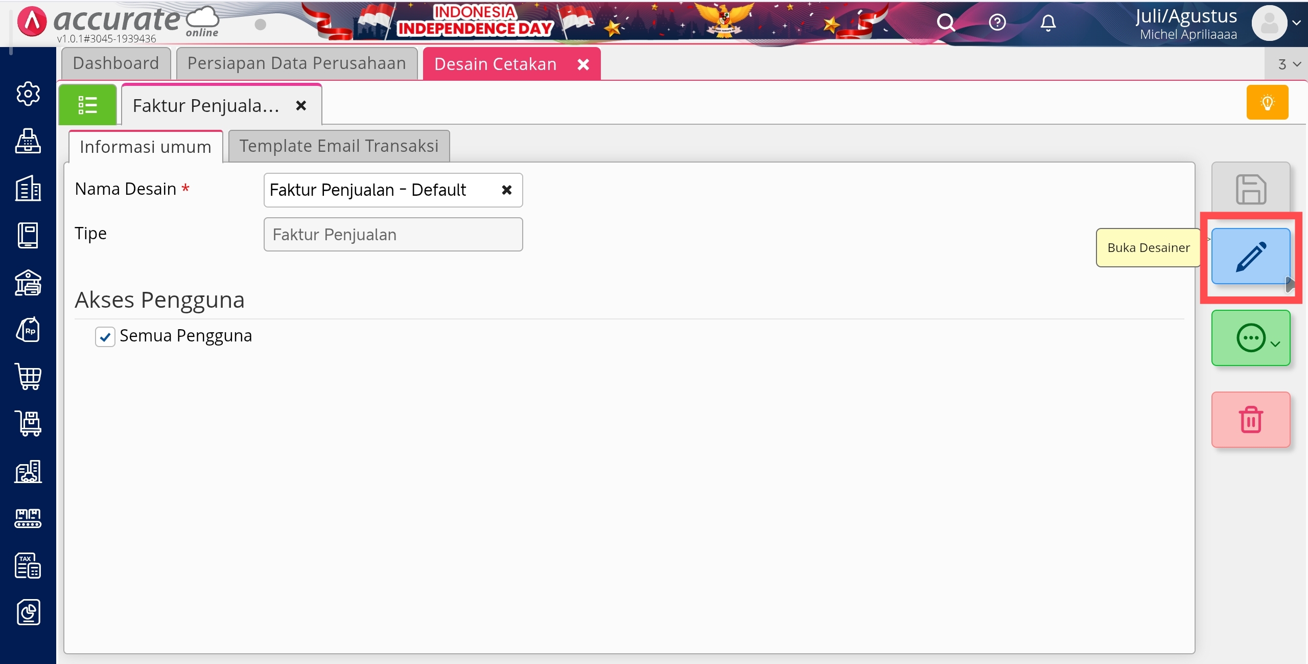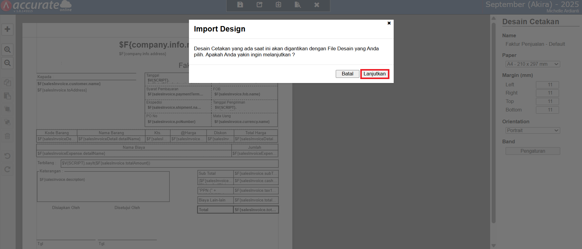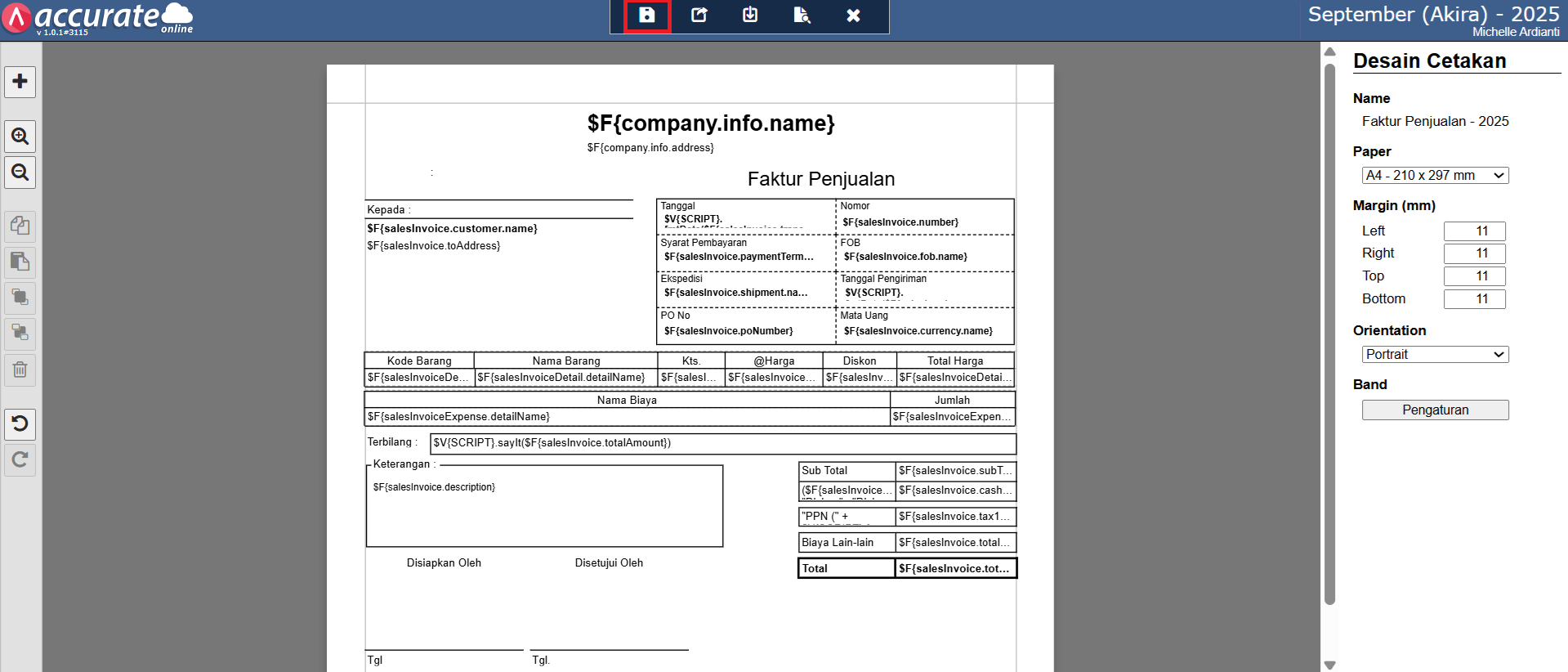 - Kemudian klik buka desainer untuk template faktur penjualan tsb.
