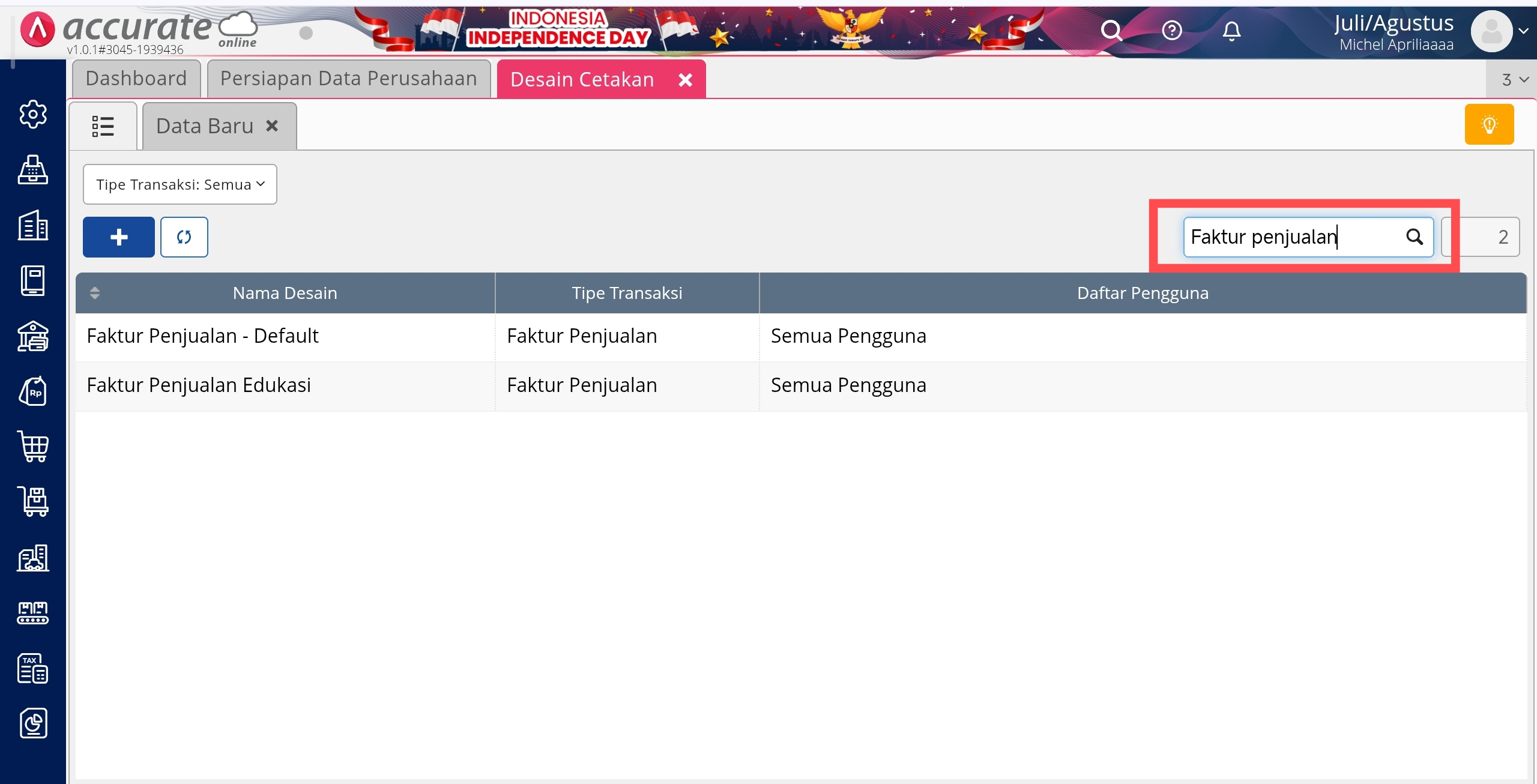 - Misalkan yang di ingin di ekspor adalah faktur penjualan, maka cari template nya di kolom pencarian lalu klik pada desain yang ingin di ekspor.