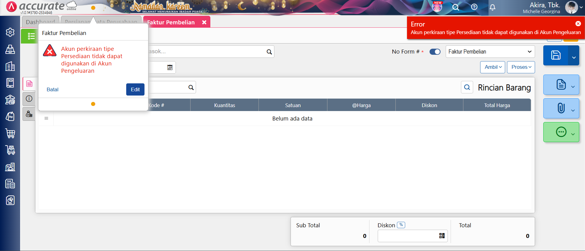 Tampilan pesan error saat simpan faktur pembelian