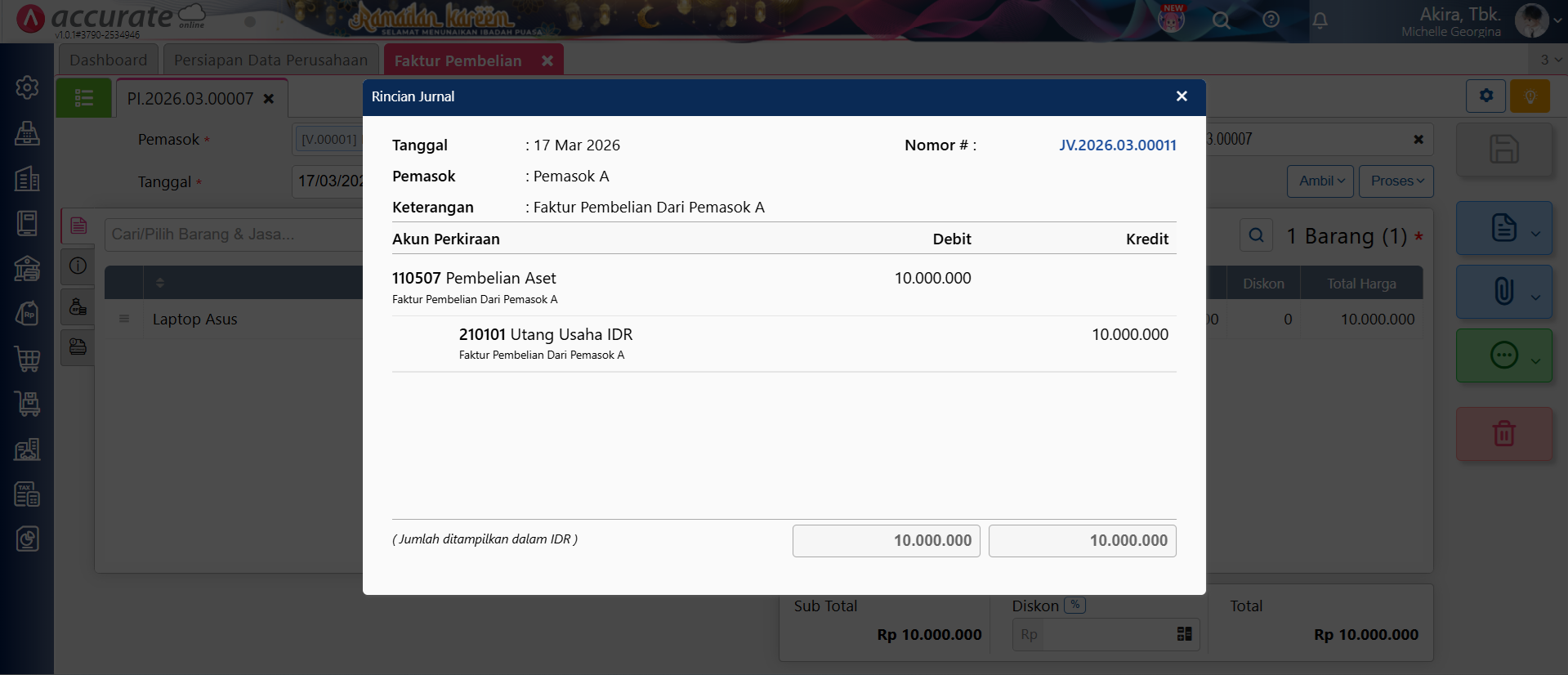 - Berikut jurnal yang terbentuk atas transaksi faktur pembelian aset tetap pada poin 4,