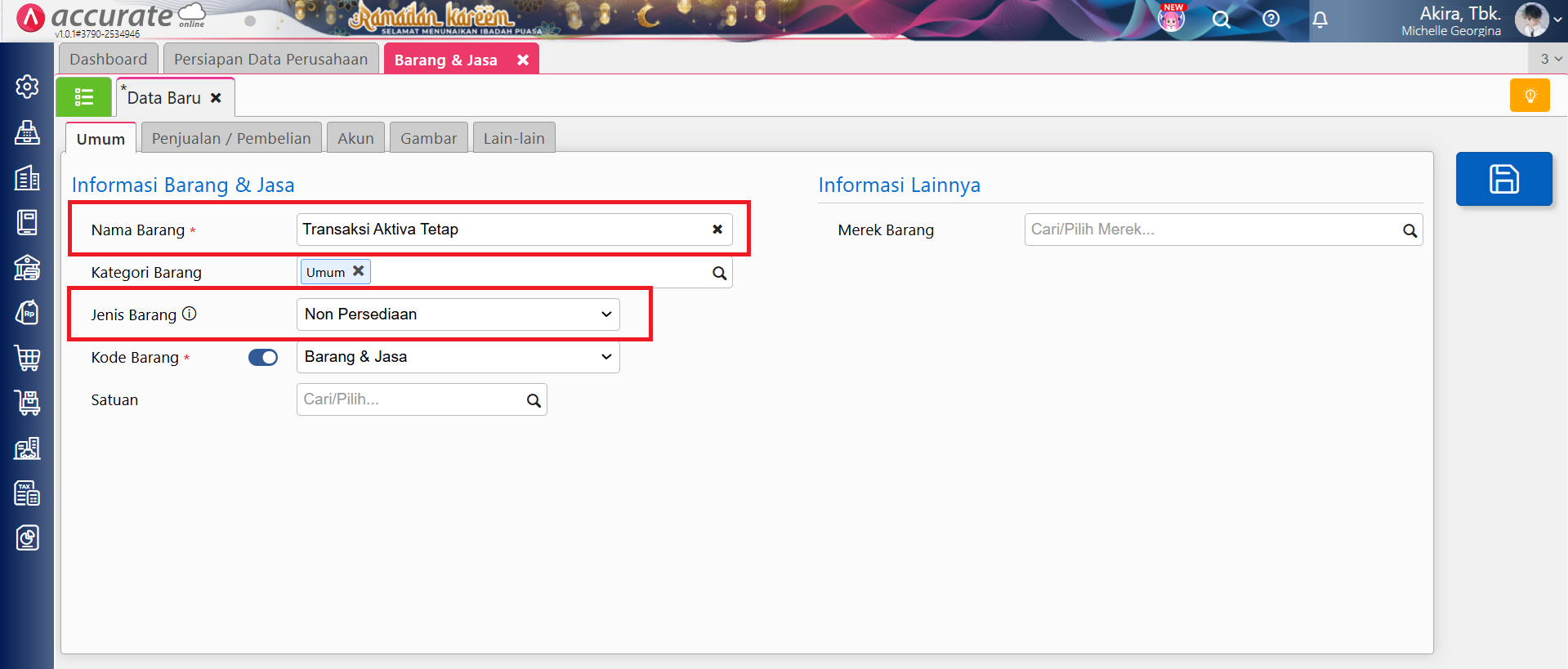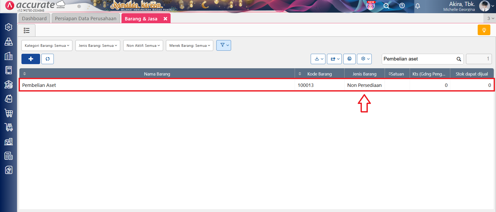Hal ini disebabkan karena barang Pembelian Aset Tetap yang dibuatkan secara otomatis oleh Accurate Online, diubah jenis barangnya dari Non Persediaan menjadi Persediaan. Sehingga ketika simpan transaksi faktur pembelian aset tetap menggunakan barang tersebut akan tampil pesan error, dan kolom jenis barang menjadi berwarna abu-abu, dan tidak bisa diubah kembali.