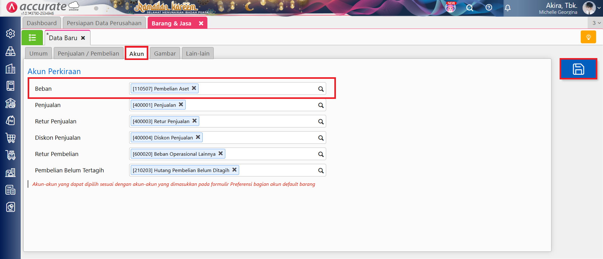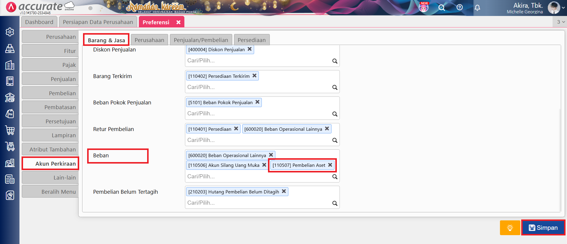 - Ke menu Pengaturan | Preferensi | Akun Perkiraan | Barang & Jasa, pada kolom Beban isikan akun Pembelian Aset, lalu klik Simpan.