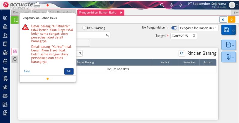 Pesan error diatas disebabkan karena ada penggunaan akun yang sama antara Akun Perintah Kerja dengan Akun Persediaan Barang yang digunakan pada transaksi Pengambilan Bahan Baku.