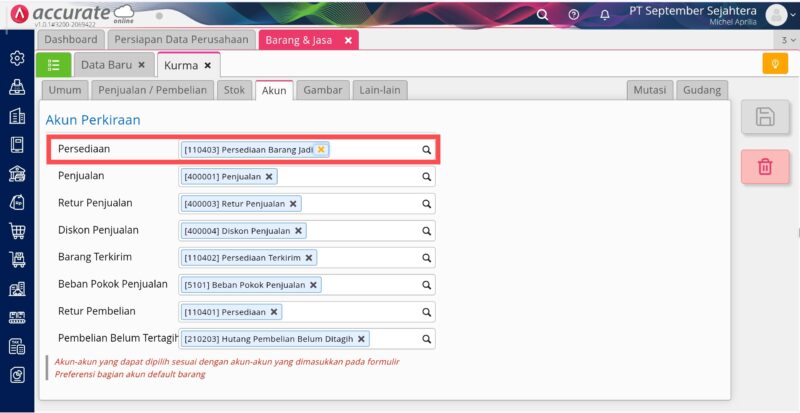 Ilustrasi : Barang Air Mineral dan Kurma yang di ambil pada transaksi pengambilan bahan baku apabila di lihat dari menu Persediaan | Barang dan Jasa | Tab Akun, pada kolom akun persediaan memilih akun “Persediaan Barang Jadi” dengan kode akun “