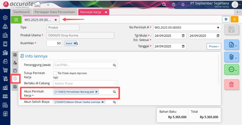 Lalu akses transaksi Perintah Kerja ke Tab Info Lainnya, pada kolom Akun Perintah Kerja akun yang di pilih juga akun “Persediaan Barang Jadi” dengan kode akun yang sama yaitu ““.
