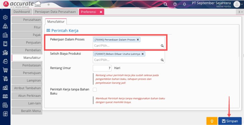 Solusi atas kendala ini adalah dengan memilih akun lain pada Akun Perintah Kerja selain akun persediaan yang digunakan pada barang/bahan baku tersebut. Apabila belum ada akun lainnya, anda bisa membuat akun baru melalui menu Buku Besar | Akun Perkiraan. Selanjutnya tambahkan akun tersebut di Akun Perkiraan Perintah Kerja melalui menu Pengaturan | Preferensi | Manufaktur dan isikan pada kolom “Pekerjaan Dalam Proses” lalu Simpan.