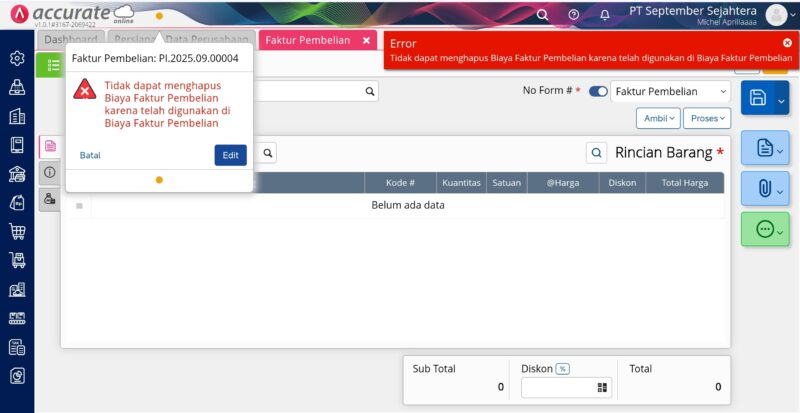 Pada saat akan menghapus Faktur Pembelian dan tampil pesan eror “Tidak dapat menghapus Biaya Faktur Pembelian karena digunakan di Biaya Faktur Pembelian” seperti gambar di bawah, hal ini dikarenakan pada faktur pembelian tsb terdapat biaya yang dialokasikan ke barang yang ditagihkan ke pemasok lain dan sudah dibuatkan Faktur Pembelian atas tagihan biaya tersebut.