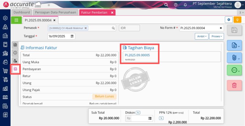 Informasi Nomor Faktur Pembelian Atas Tagihan Biaya di tab Informasi Faktur