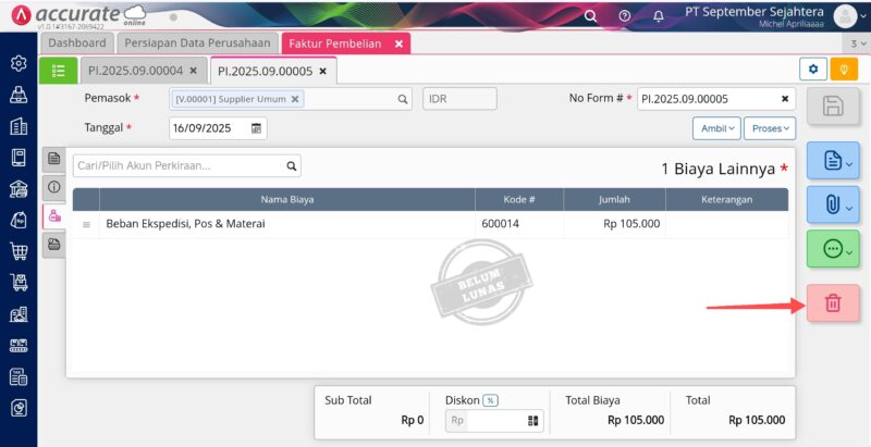 Hapus Faktur Pembelian Atas Tagihan Biaya