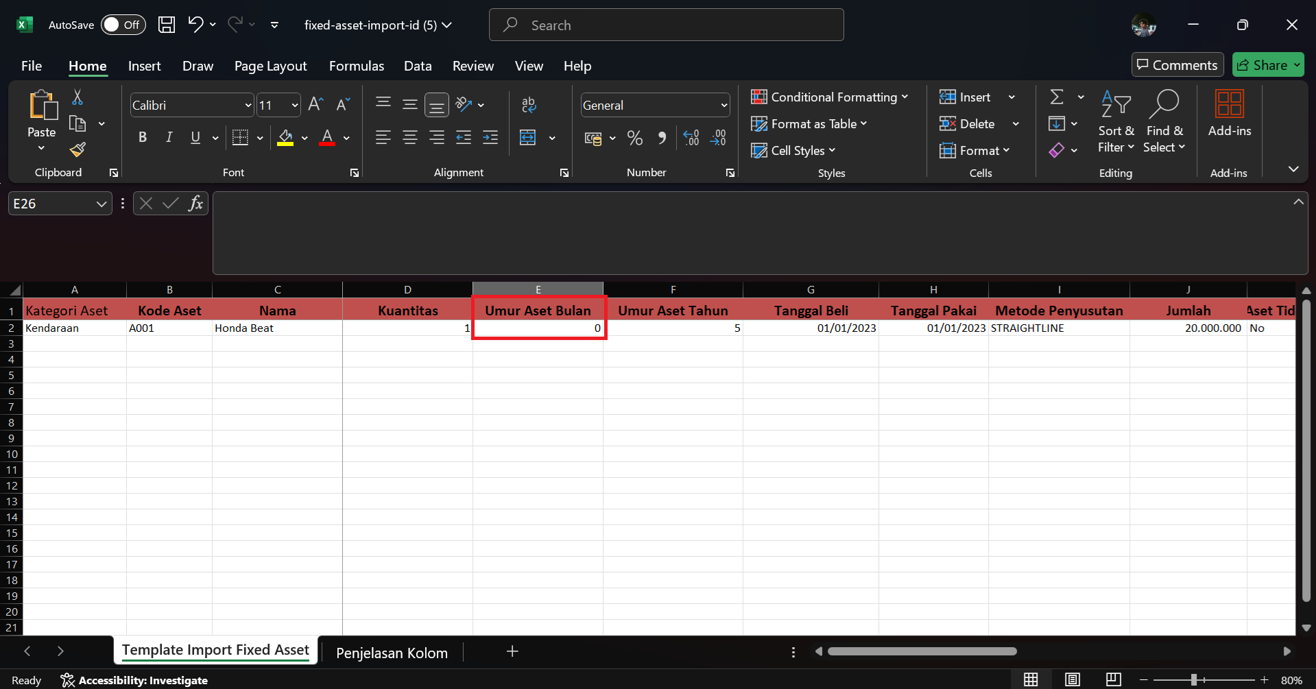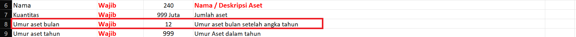 Sebagai ilustrasi, semisal akan diimpor data Kendaraan Motor Beat dengan umur aset 5 tahun, maka untuk kolom ‘Umur Aset Bulan’, silahkan diisikan 0 saja dan anda hanya perlu isikan kolom ‘Umur Aset Tahun’ senilai 5, karena masa manfaat-nya dalam tahun.