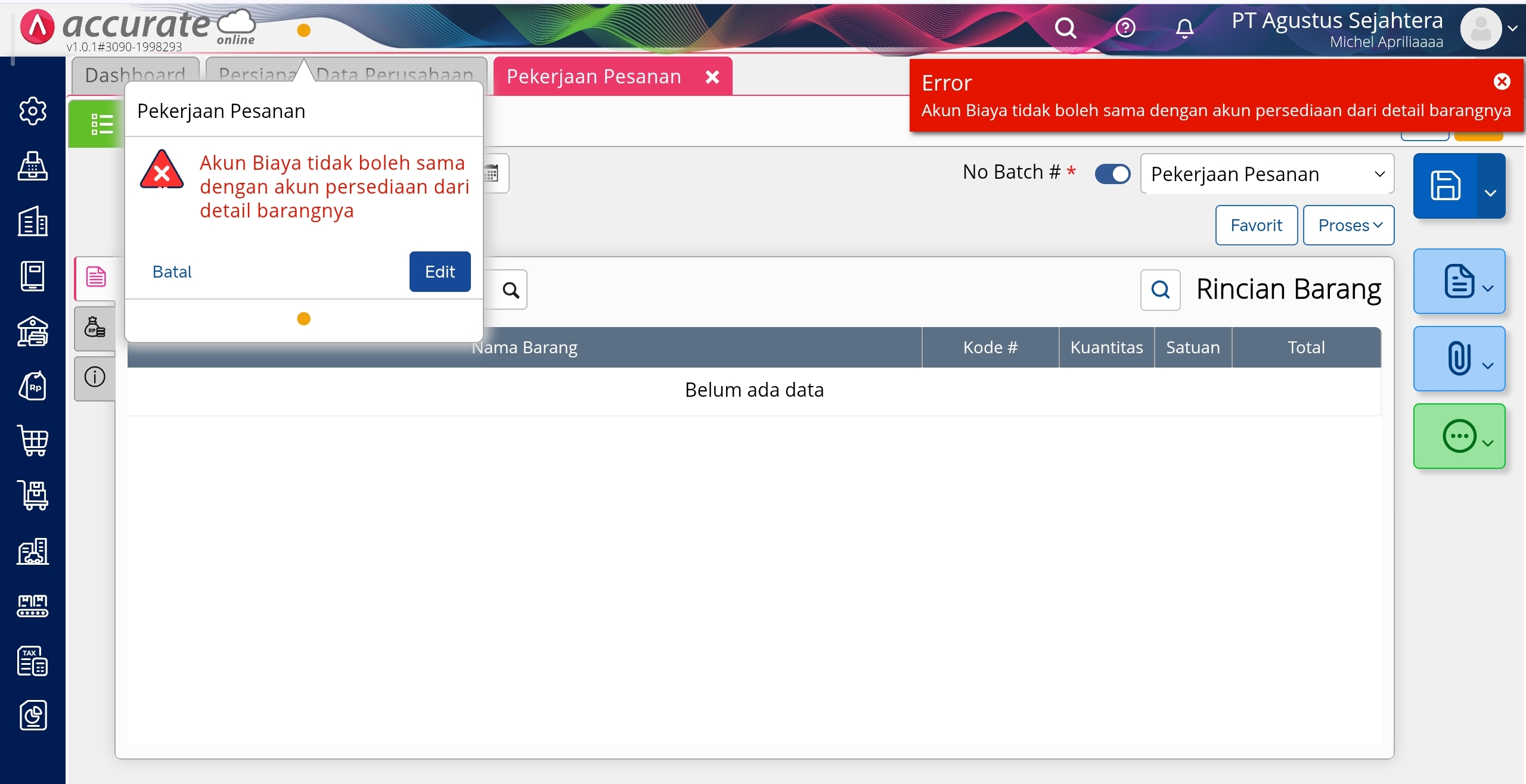 Dengan kondisi tersebut, saat menyimpan transaksi Pekerjaan Pesanan-nya akan tampil pesan eror “Akun Biaya Tidak Boleh Sama Dengan Akun Persediaan dari Detail Barangnya”. Hal ini dikarenakan akun Pekerjaan digunakan sebagai akun penampung dalam pengeluaran barang pada transaksi pekerjaan pesanan, sehingga tidak memungkinkan untuk menggunakan akun yang sama dengan Akun Persediaan/Biaya pada barang yang digunakan di transaksi Pekerjaan Pesanan tersebut.