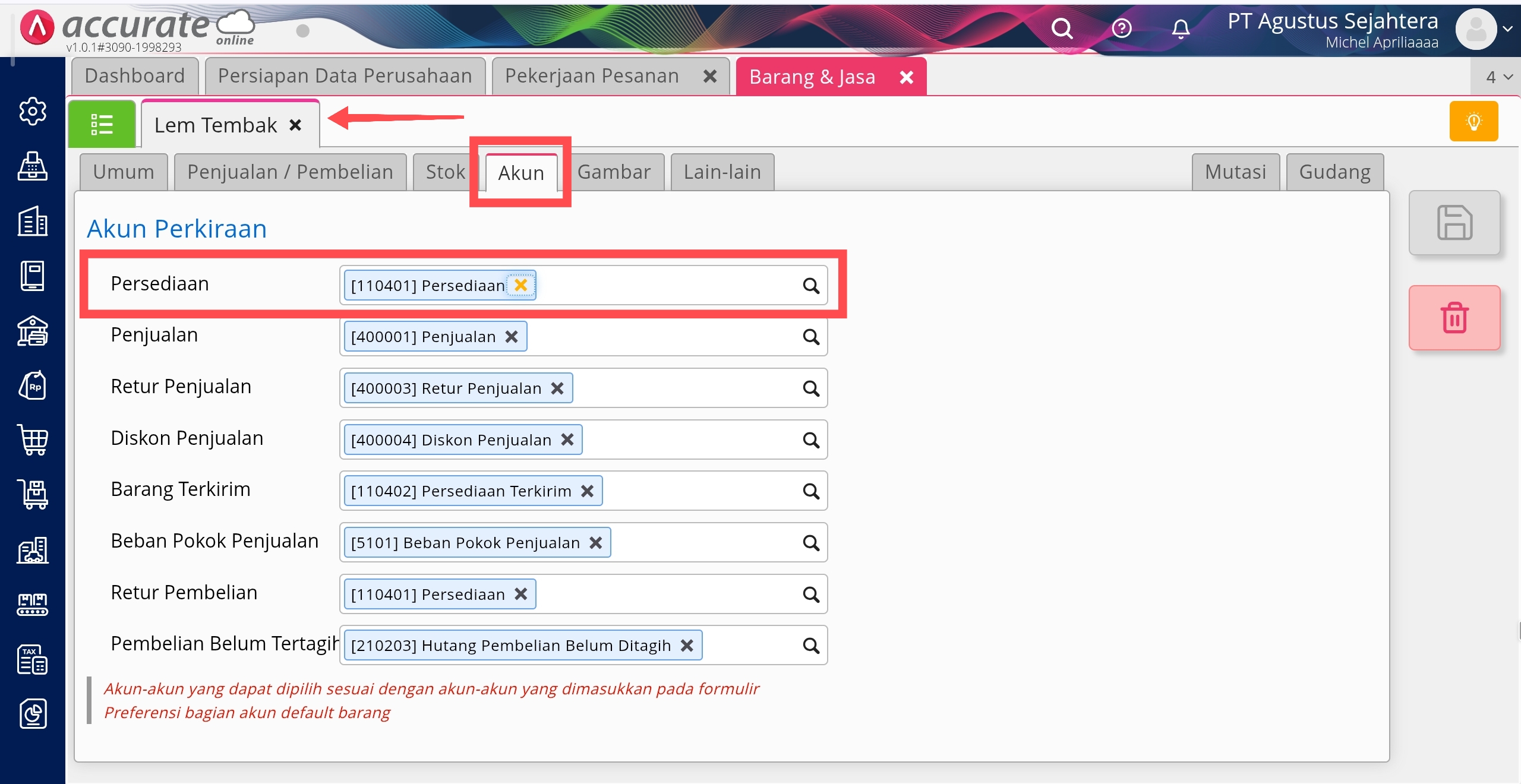 Sebagai ilustrasi, barang Lem Tembak” yang terdapat pada transaksi pekerjaan pesanan apabila dilihat dari menu Persediaan | Barang dan Jasa| Tab Akun, pada akun persediaan-nya memilih ke akun “[110401] Persediaan”.