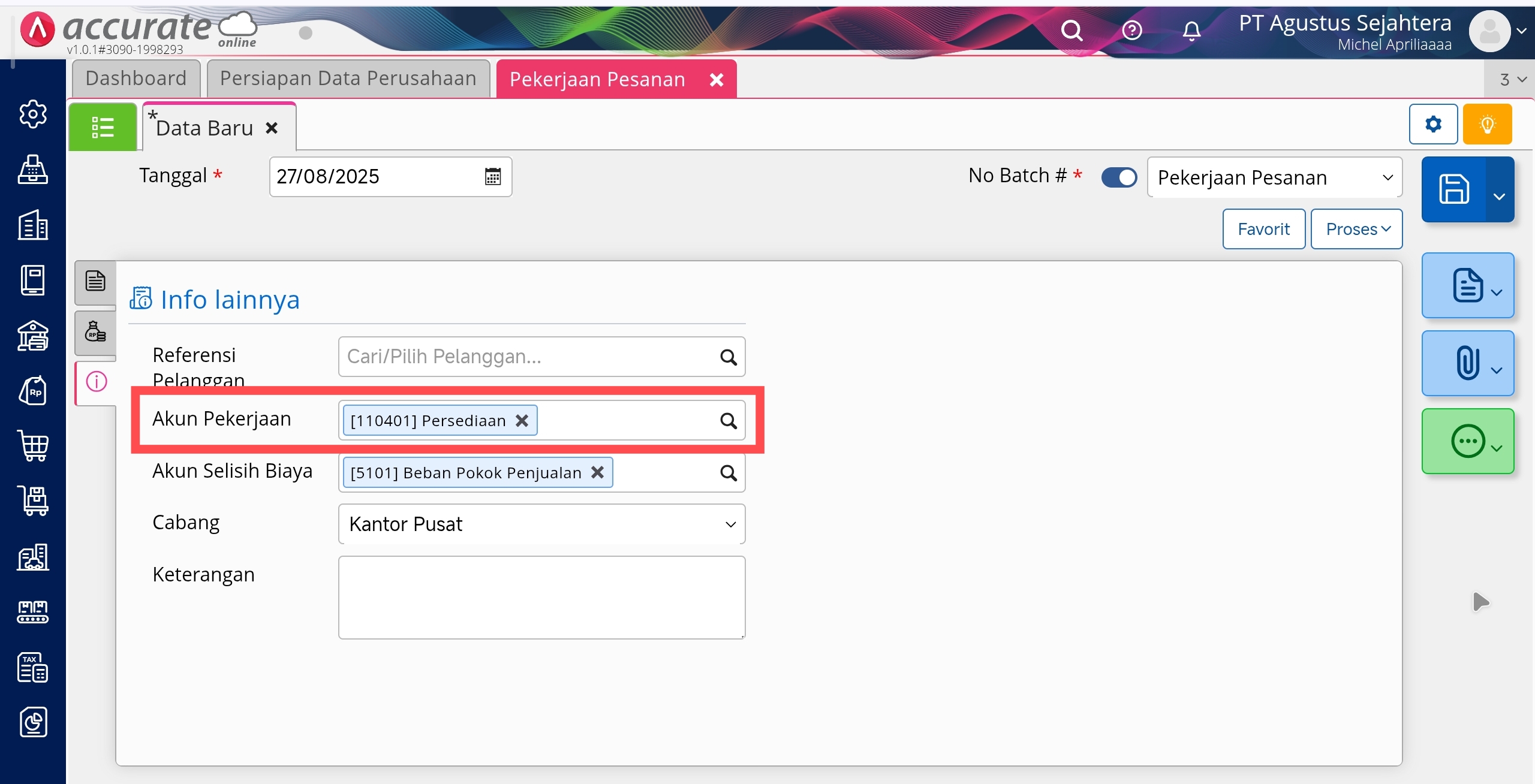 Dan pada transaksi Pekerjaan Pesanan pada tab Info Lainnya, untuk Akun Pekerjaan juga memilih akun “[110401] Persediaan”.
