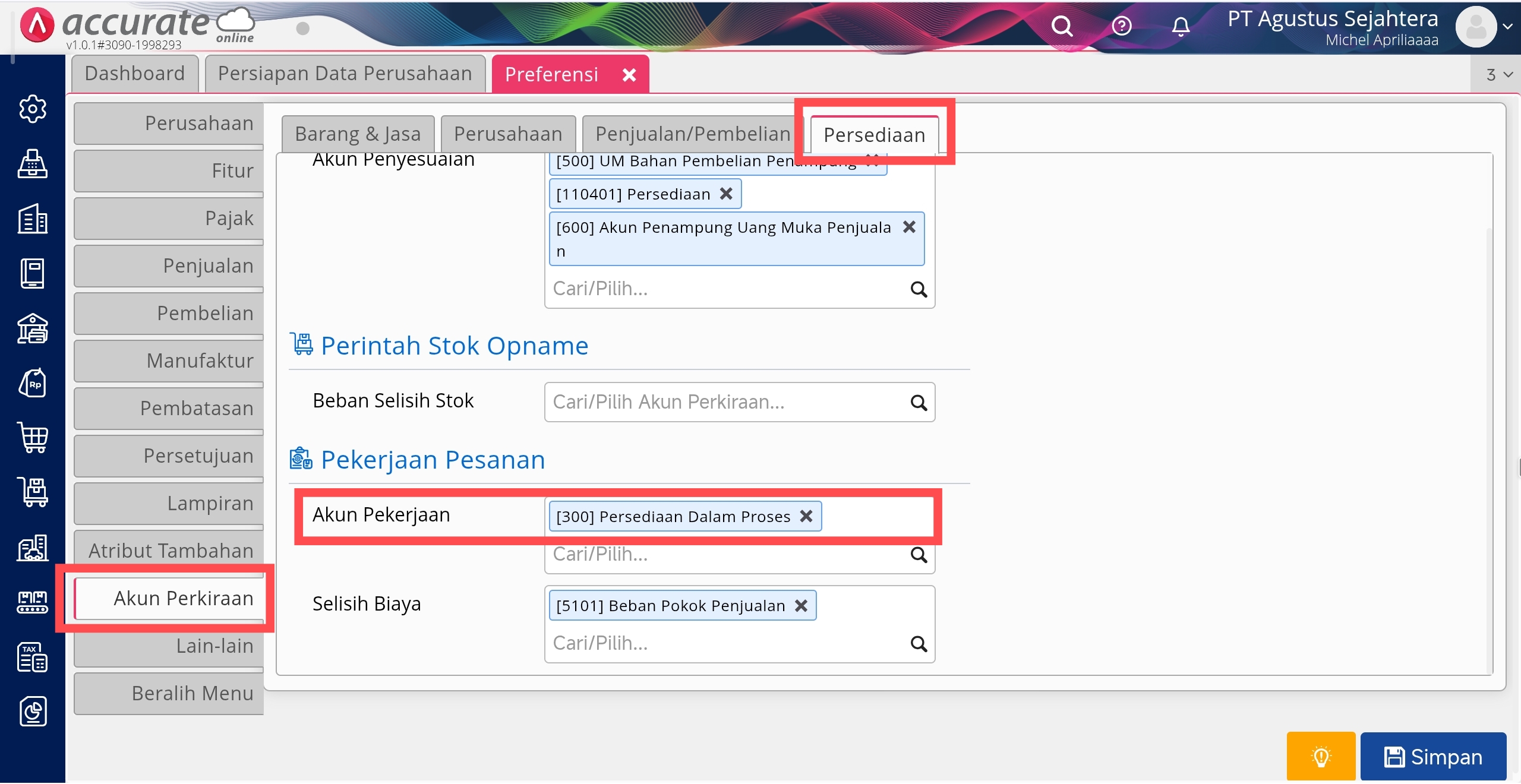 Kemudian anda perlu menambahkan Akun Pekerjaan melalui menu Pengaturan | Preferensi | Akun Perkiraan | Persediaan, yaitu pada bagian Akun Pekerjaan Pesanan (perhatikan gambar).