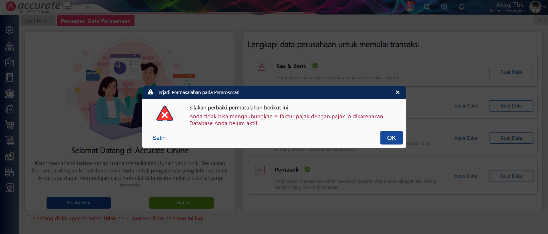 Pada Accurate Online, ketika menghubungkan e-faktur dan tampil pesan error “Anda tidak bisa menghubungkan e-faktur pajak dengan pajak.io dikarenakan Database Anda belum aktif”, seperti gambar berikut ini: