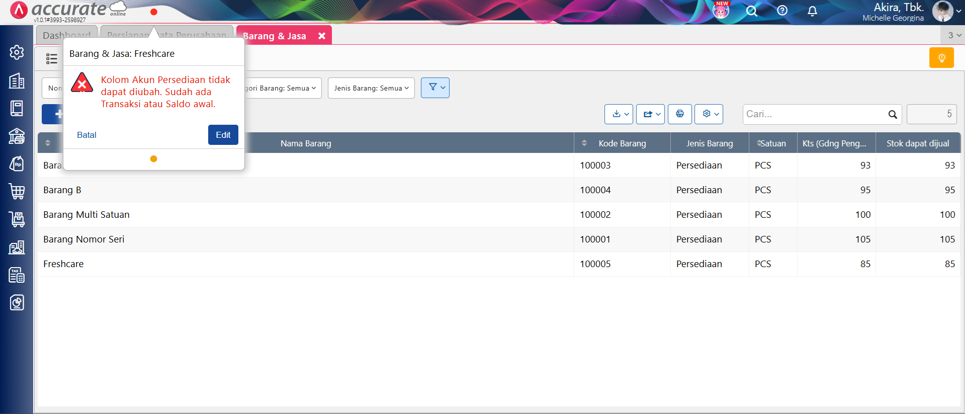 Pada Accurate Online, ketika ubah akun persediaan pada barang dan tampil pesan error “Kolom Akun Persediaan tidak dapat diubah. Sudah ada Transaksi atau Saldo awal.” seperti gambar berikut: