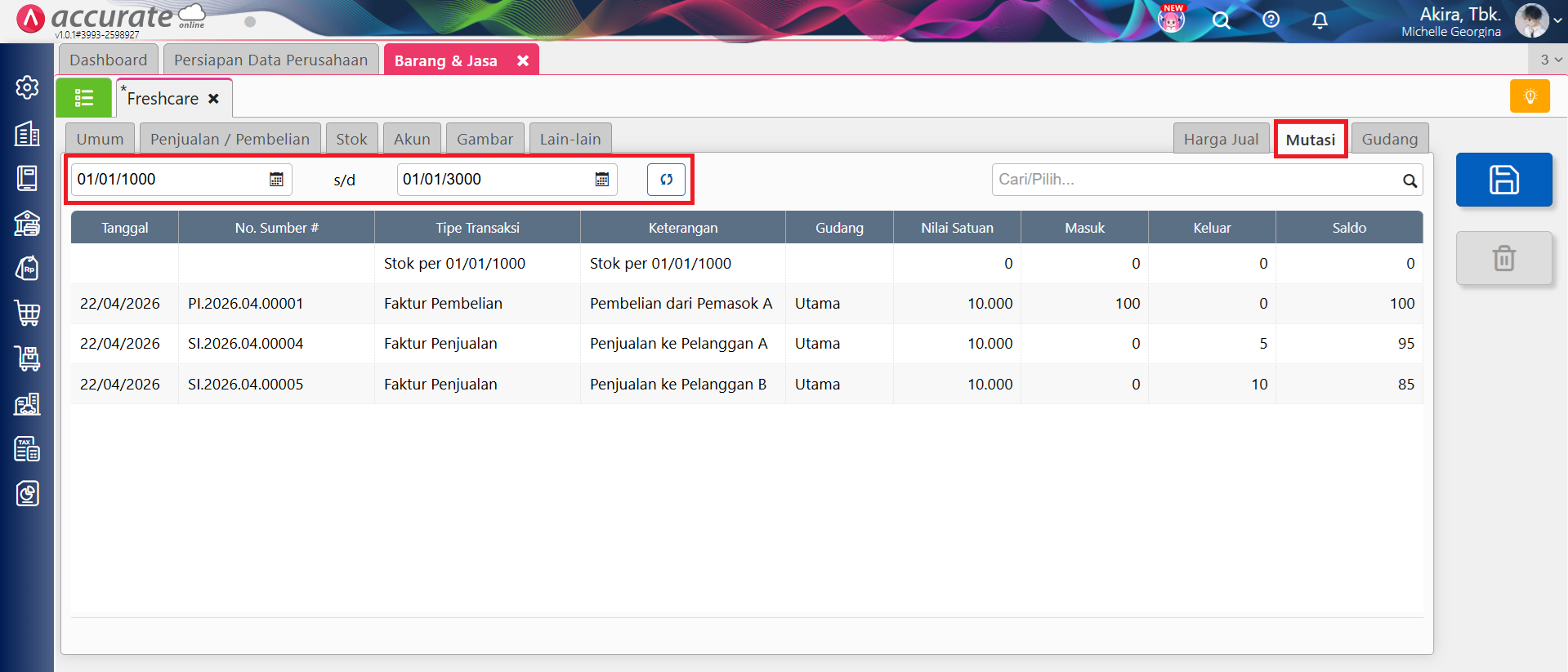 - Sedangkan apabila barang tersebut sudah digunakan dalam transaksi, lakukan pengecekan melalui tab Mutasi dengan mengatur parameter tanggal dari 01/01/1000 s.d. 01/01/3000.