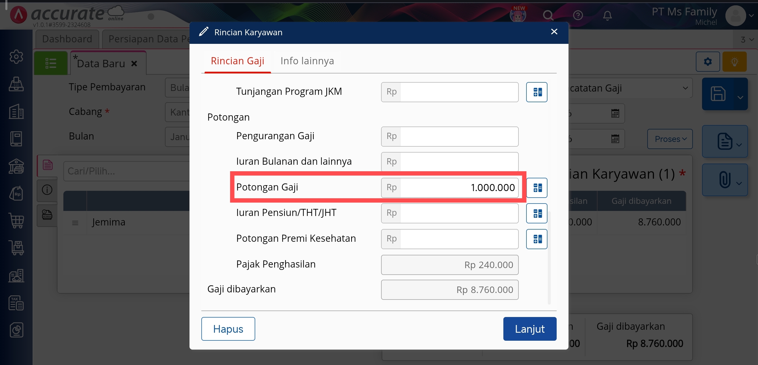 Informasi Total Angsuran yang terdapat pada Potongan Gaji di Pencatatan Gaji