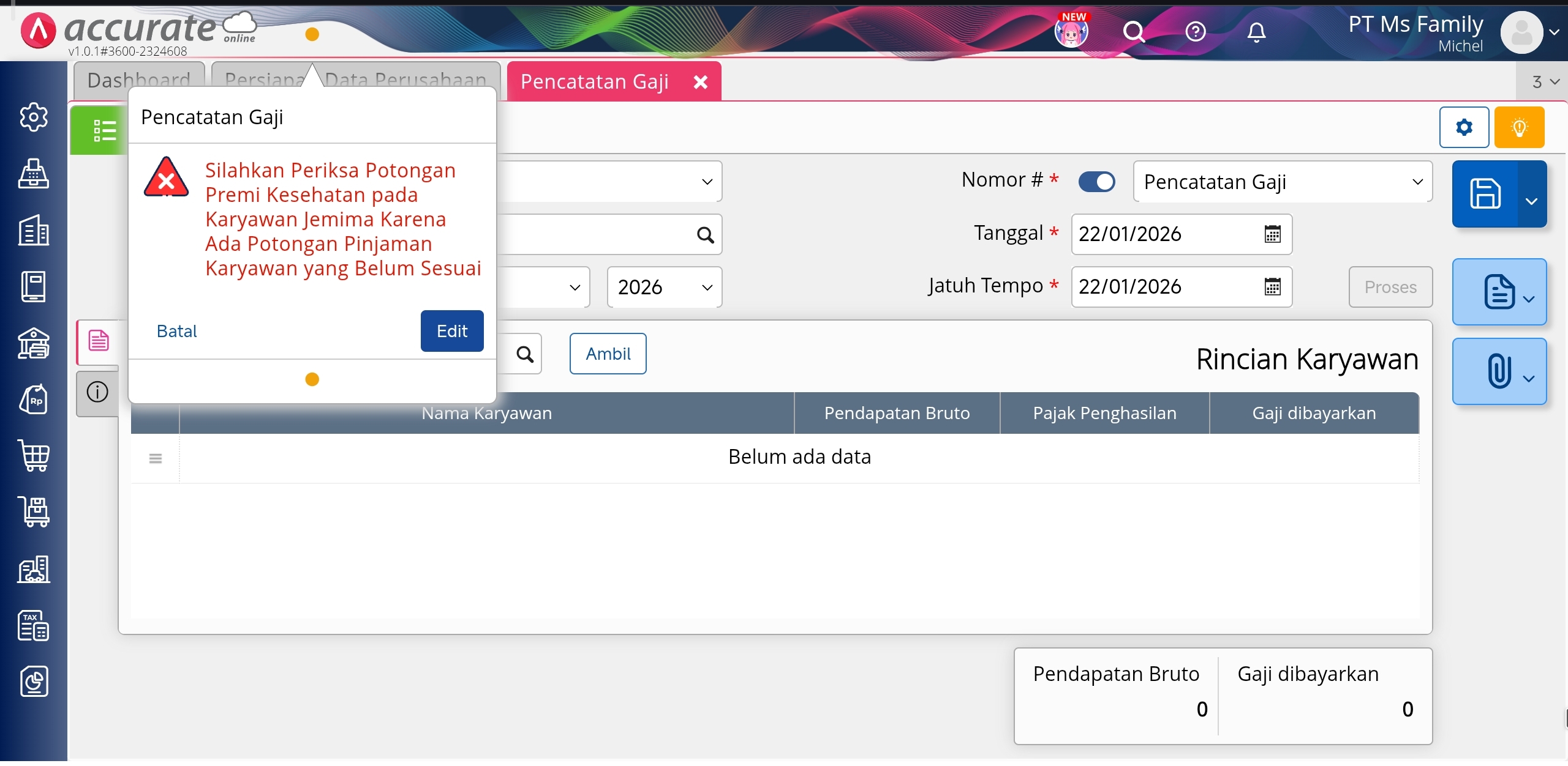 Pada saat Anda membuat pencatatan gaji, kemudian tampil pesan error seperti gambar berikut ini.