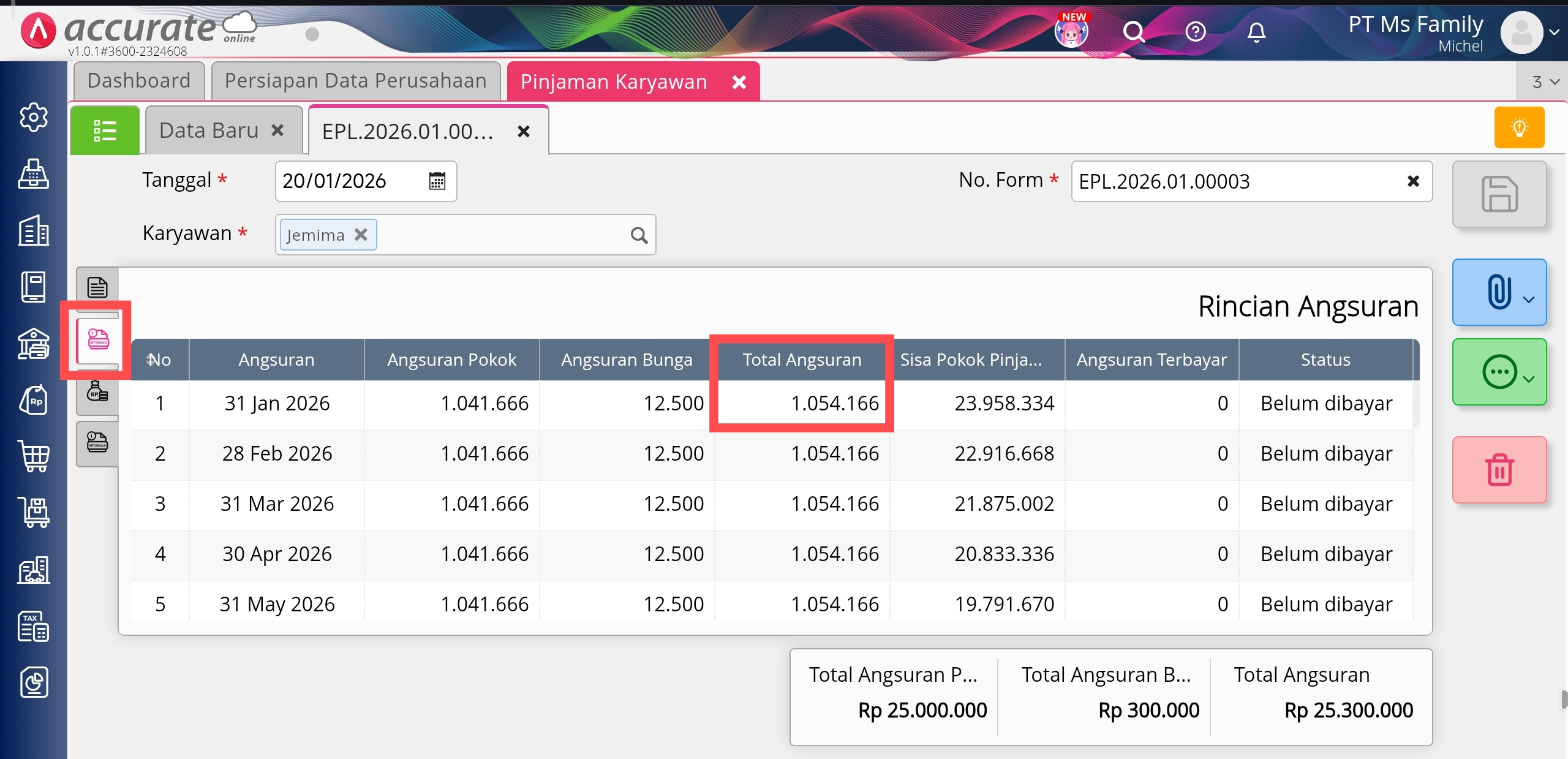 Berikut langkah-langkah untuk melakukan pengecekan nilai angsuran pada rincian angsuran pinjaman karyawan: